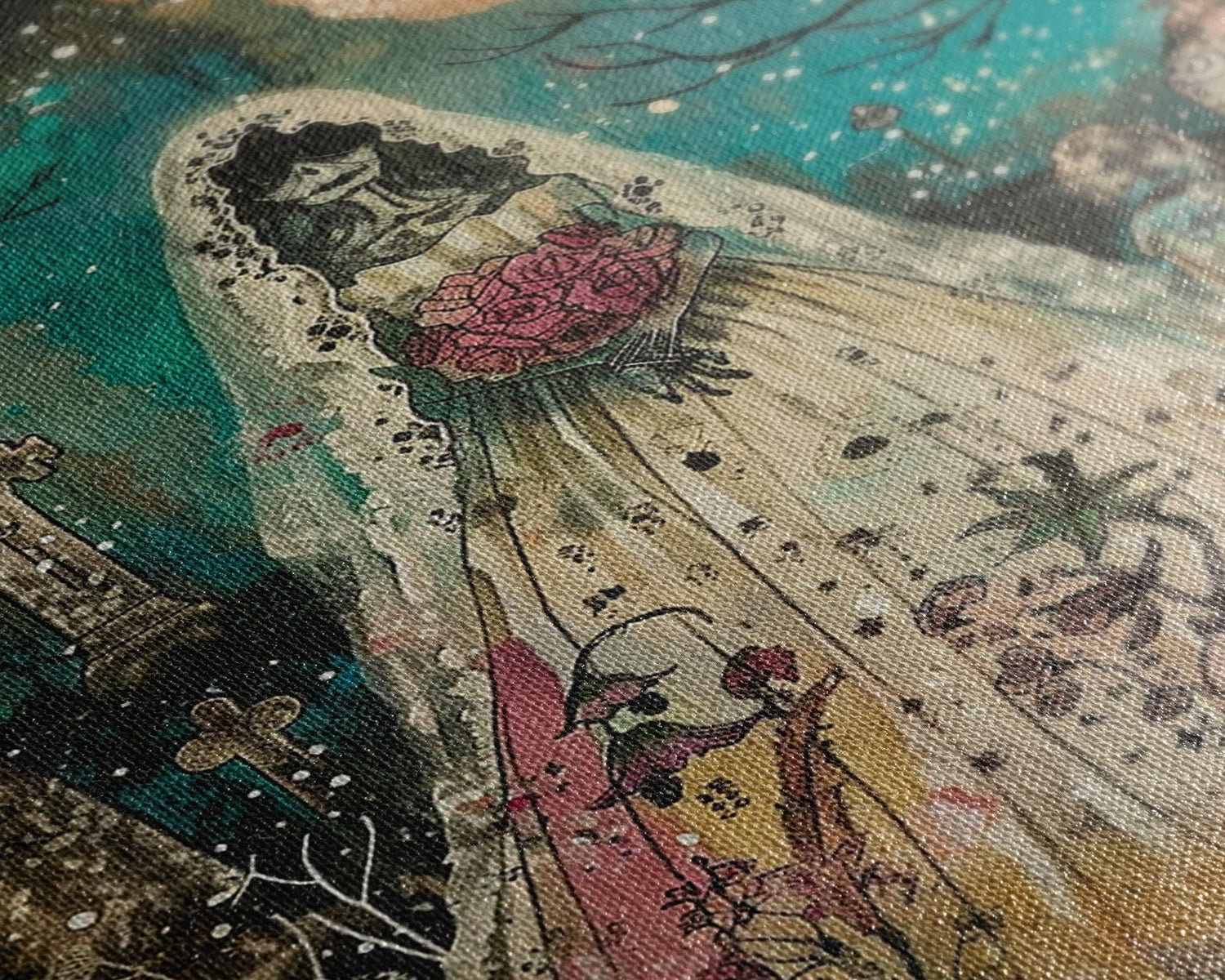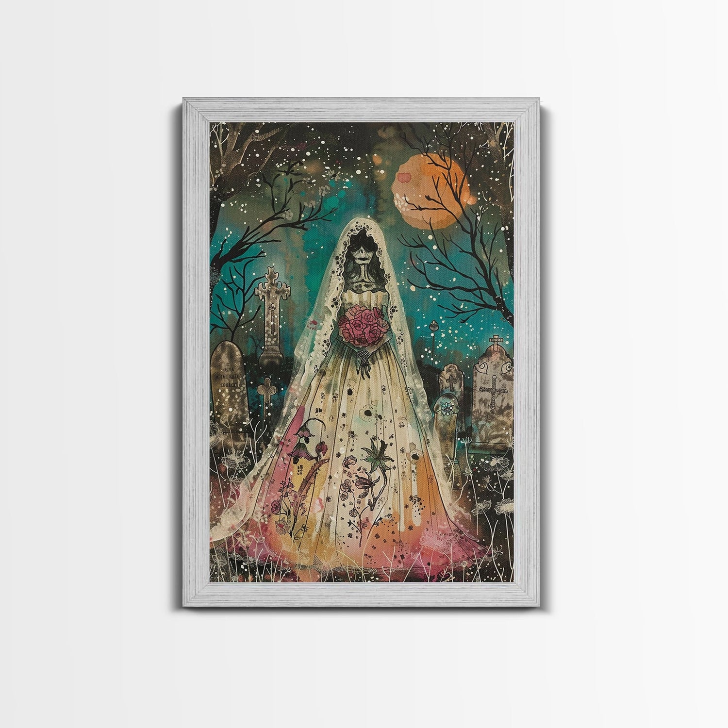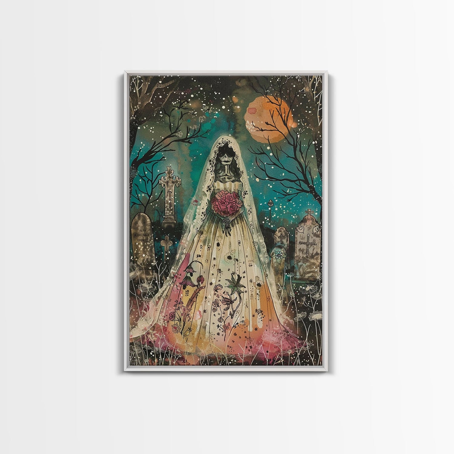 Halloween Skeleton Bride in Cemetery, Framed Canvas Print, Wall Art, Living Room Decor, Spooky, Skeleton Art, Original Painting, Home Decor