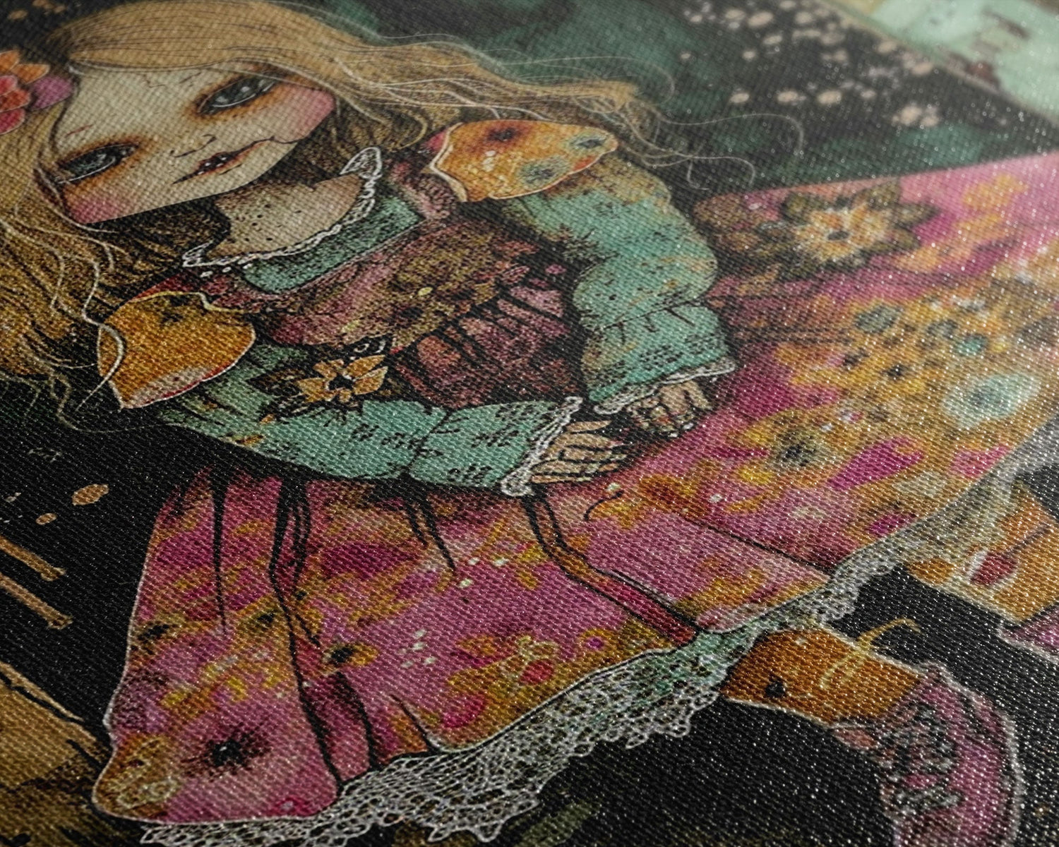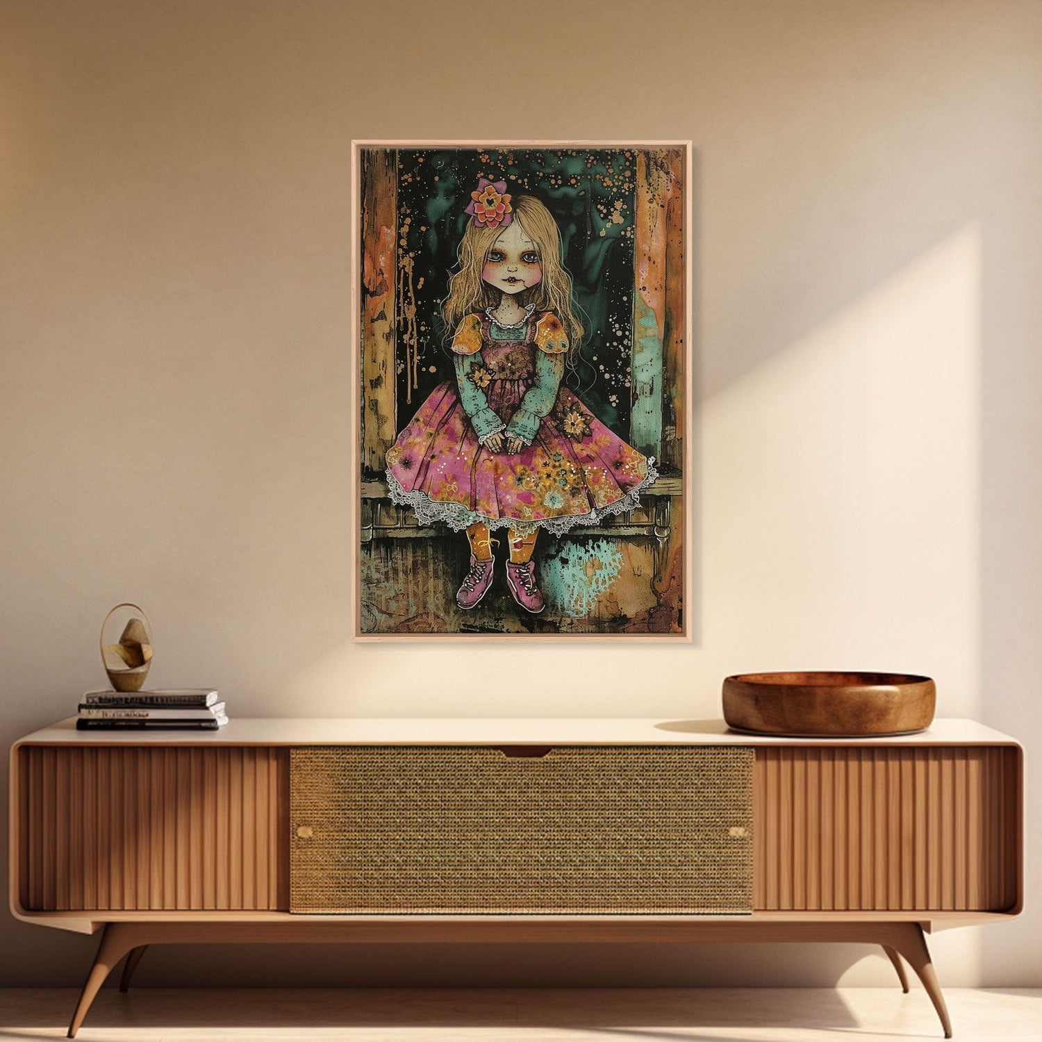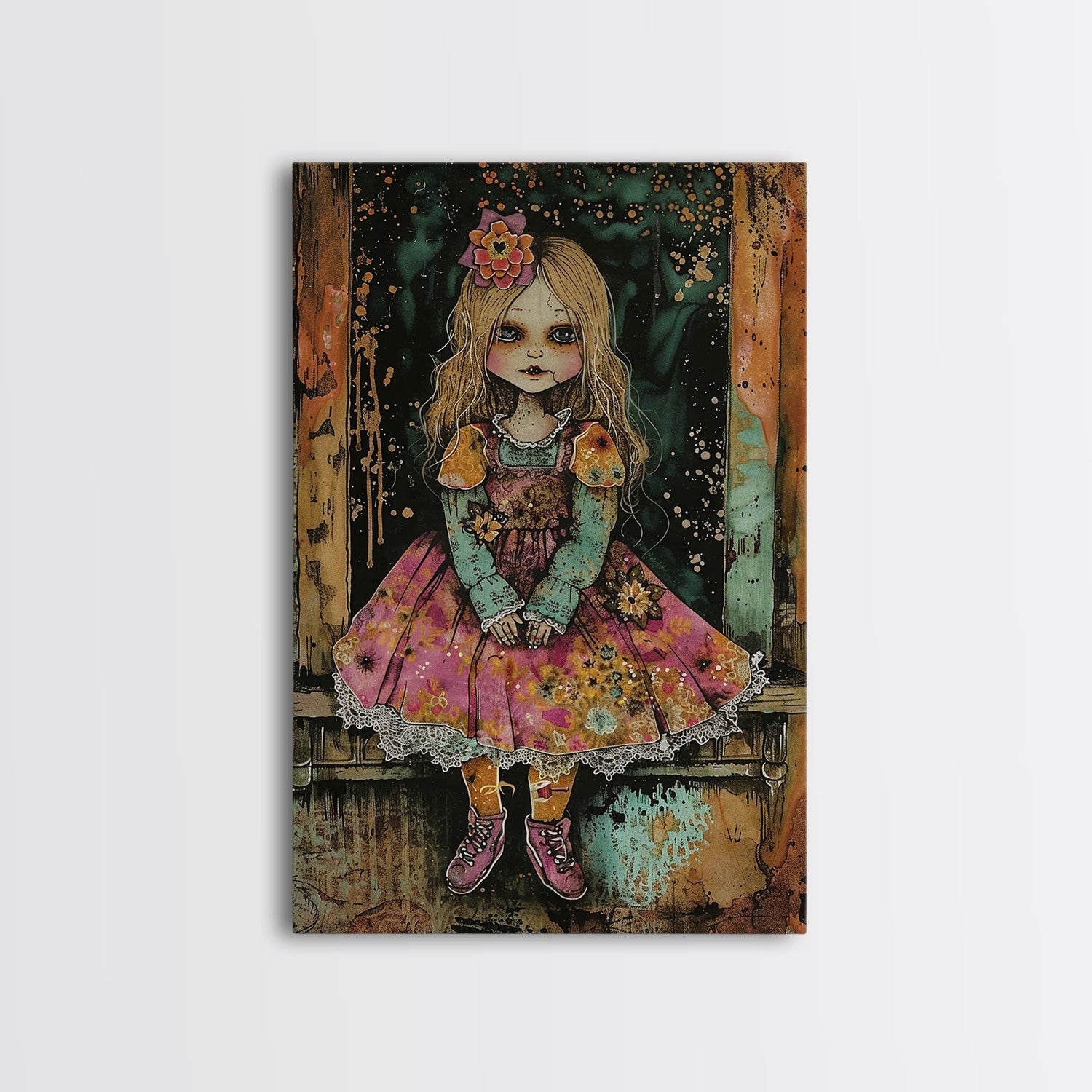 Halloween Witch in Forest Framed Canvas Print, Spooky Decor, Living Room Art, Whimsical Halloween Wall Art, Home Decoration, Retro Style Art