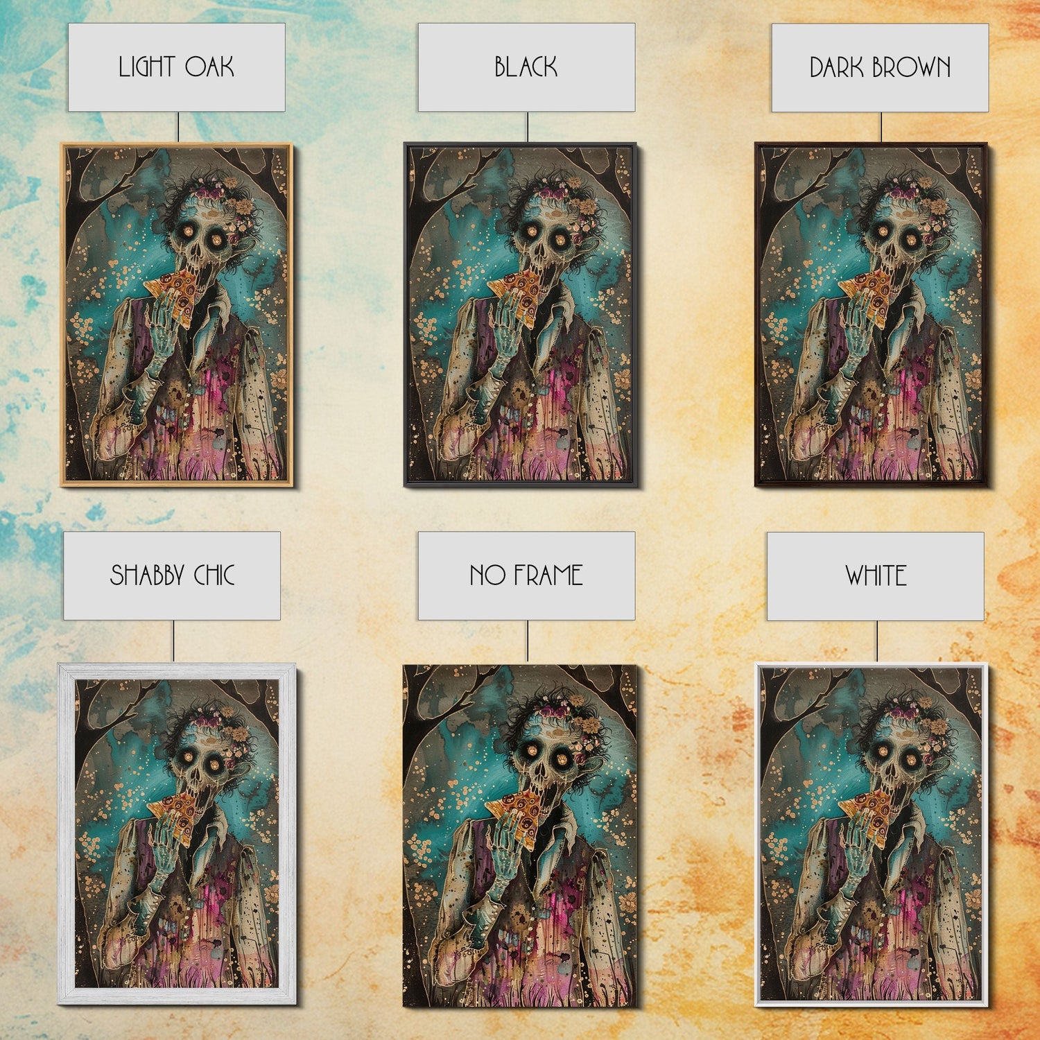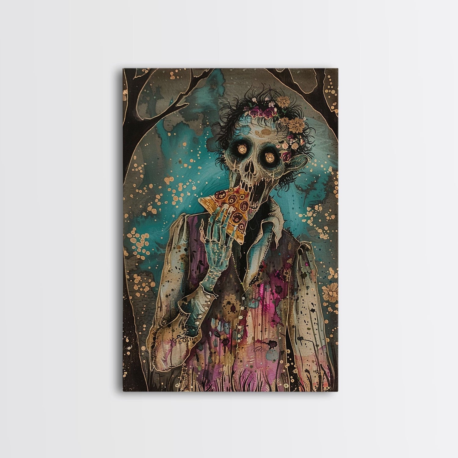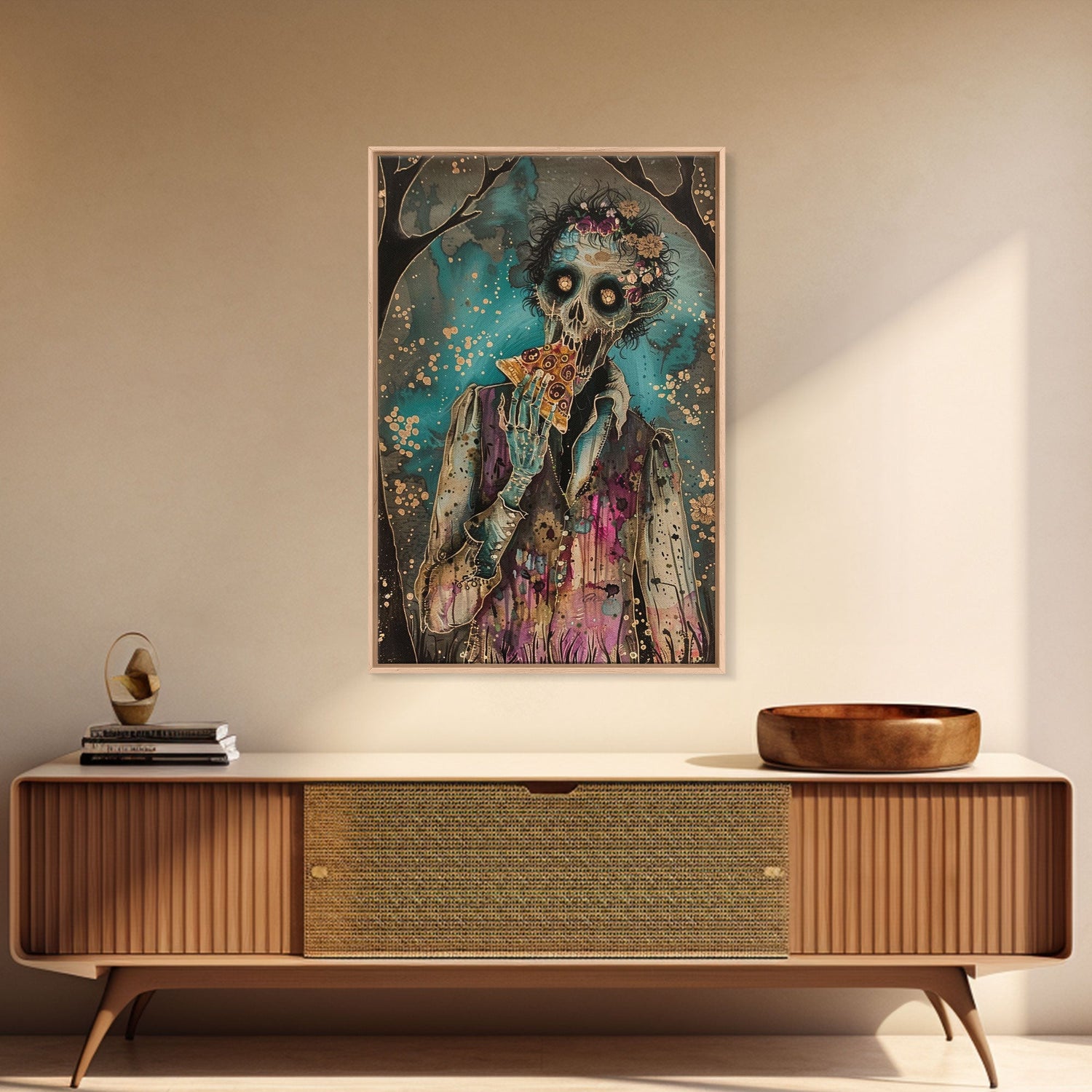 Halloween Zombie Eating Pizza, Framed Canvas Print, Wall Art, Living Room Decor, Spooky, Zombie Art, Original Painting, Home Decor