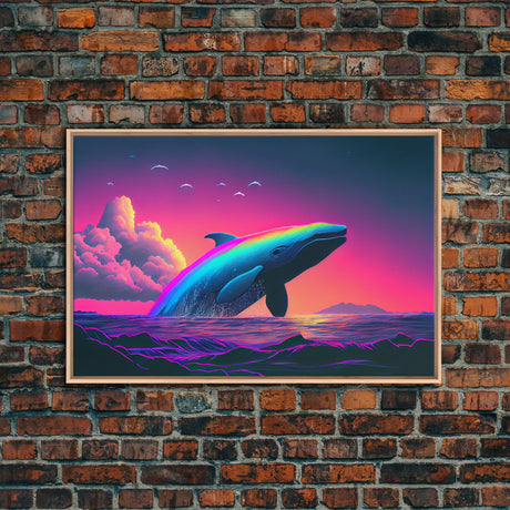 Humpback whale breaching a rainbow, vaporwave art, synthwave animal print, framed canvas print