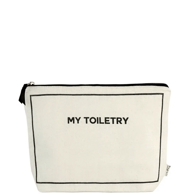 A soft toiletry pouch designed to keep makeup, skincare, and daily essentials organized at home or while traveling. Made from cotton with a laminated, wipeable lining, it helps contain spills and makes cleanup easy. Finished in Cream with a clean, unisex look, this pouch combines everyday function with thoughtful design, it’s ideal for travel, home organization, and gifting. This product comes with “MY TOILETRY” print on the front. It can also be personalized with a monogram or embroidery.