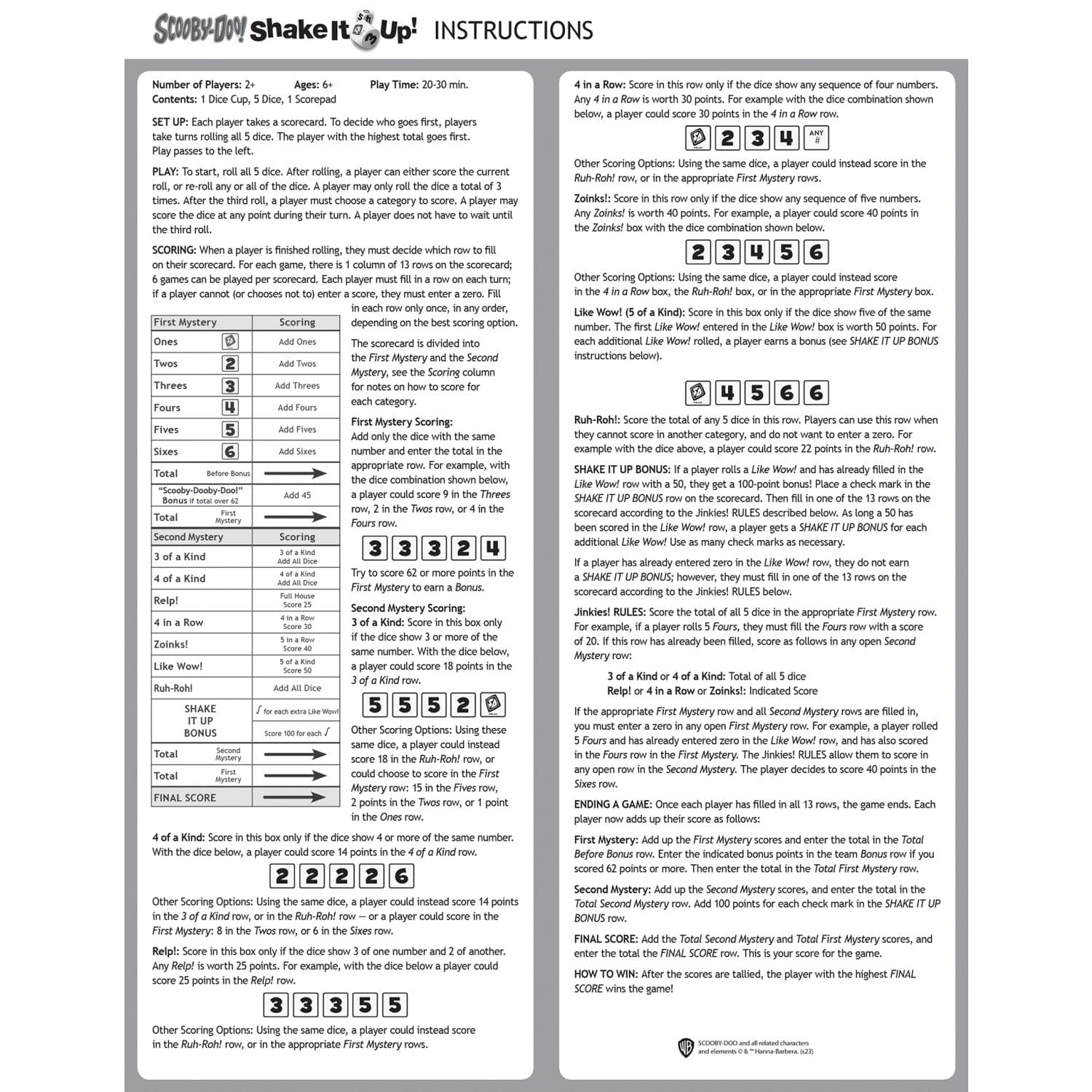 This MasterPieces Scooby-Doo Shake it Up! Dice Game is a collectible travel dice game for Scooby fans! This mystery-rolling dice game is perfect for game night with the family. Try to get as many points as possible by rolling different combinations of all five dice. The Shake it Up! Dice Game includes a Scooby-Doo dice cup, 5 Scooby-Doo dice, and a Scooby-Doo scorepad! Two or more Scooby fans, ages 6+, can play this travel dice game!