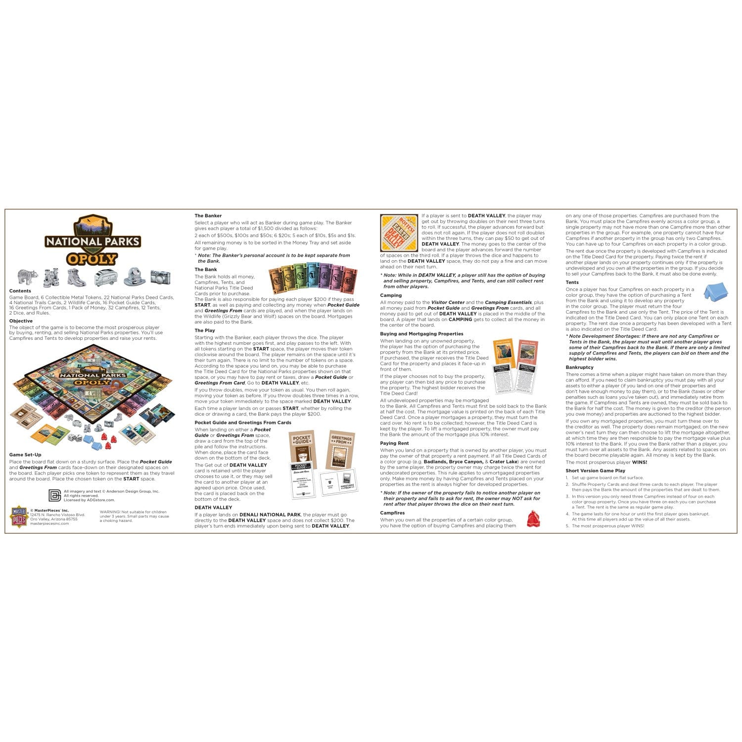 Embark on a fun and educational journey with Masterpieces National Parks Opoly by Anderson Design Group, a nature board game that brings the excitement of America’s National Parks to your table. Inspired by classic opoly board games, this parks game features a beautifully designed board with iconic landmarks, wildlife, and National Trails, making it perfect for family game night or a road trip board game adventure. Collect properties, answer unique trivia about each park, and compete to win with six collectible metal tokens, including a black bear, RV, and Park Ranger Hat. The set includes 22 property cards, 4 National Trails cards, 2 Wildlife cards, 16 greetings from cards, 16 pocket guide cards, 1 pack of money, 32 campfires, 12 tents, 2 dice, and easy-to-follow instructions. Designed for two to six players, this adultopoly board game alternative is suitable for both kids and adults, offering hours of strategic play and learning. Crafted with durable plastic, cardboard, and metal, the game comes in a reinforced box with foam insert for safe storage. Dimensions are 15 x 12 x 2 inches, and no assembly or batteries are required. Discover the wonders of America’s National Parks and create lasting memories with this engaging family and educational board game.