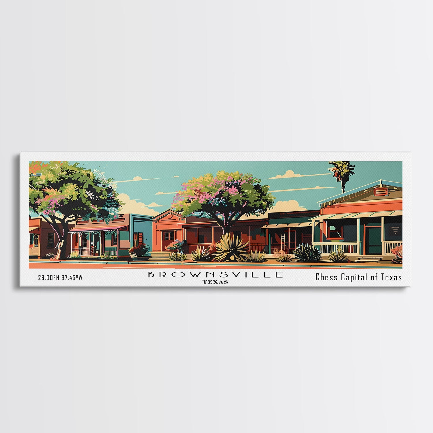 Brownsville Texas Panoramic Painting, Framed Canvas Print, Mid Century Modern Wall Art, Retro Pop Art Travel Poster, Living Room Decor, City Art