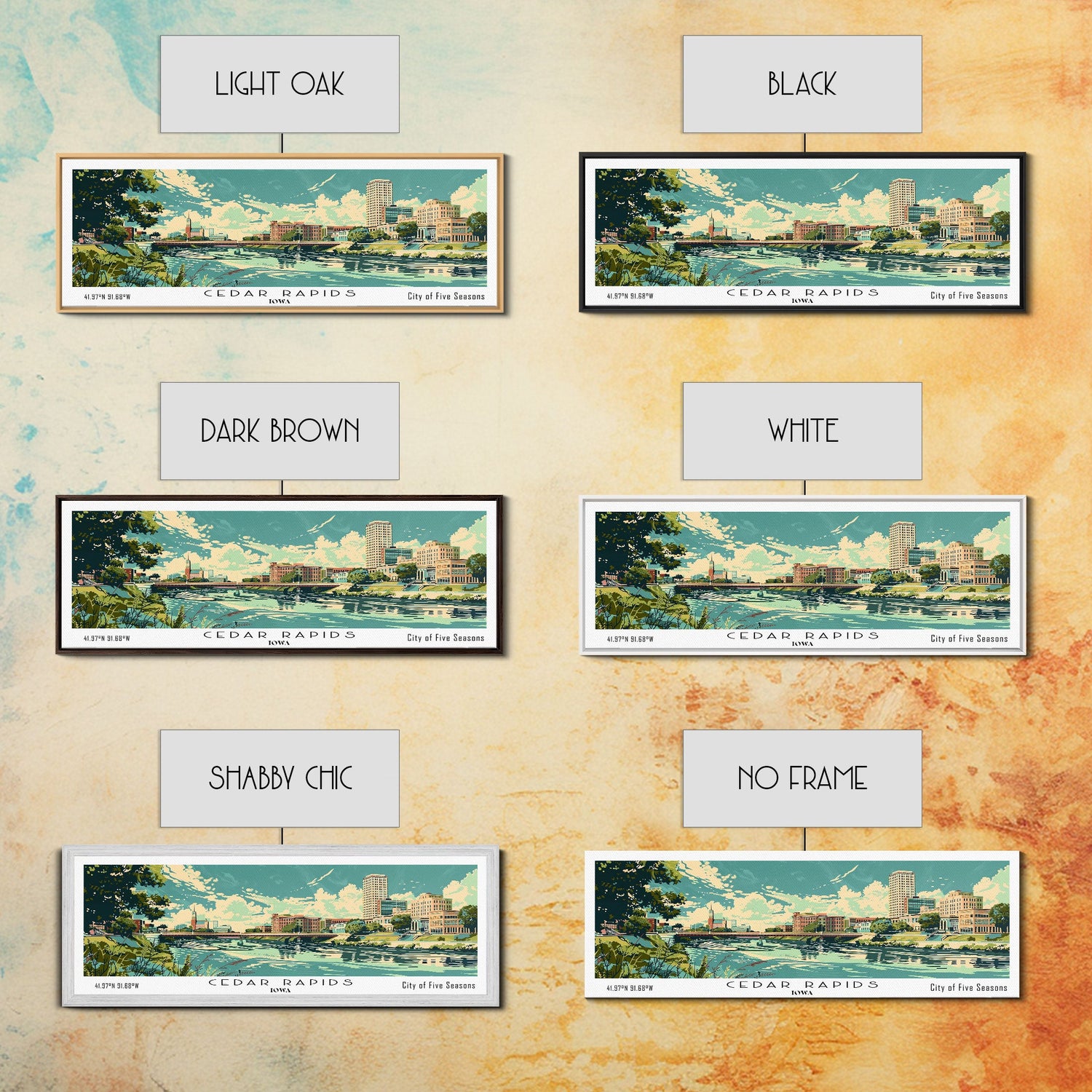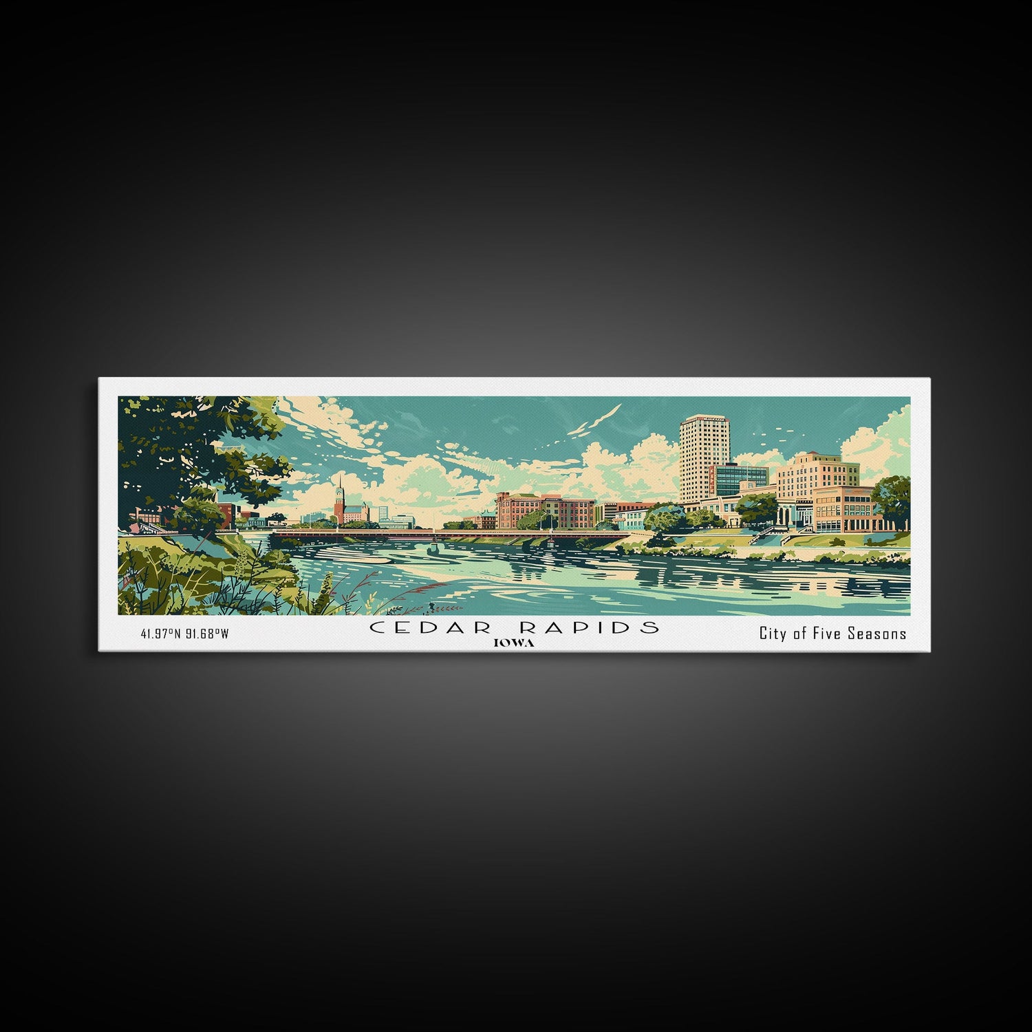 Cedar Rapids Iowa Panoramic Painting, Mid Century Modern Framed Canvas Print, Retro Pop Art Travel Poster, Living Room Wall Art Decor, City Print
