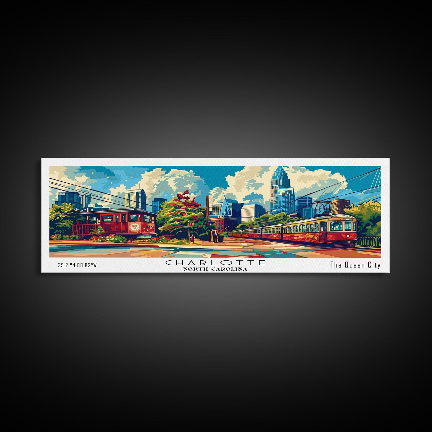 Charlotte North Carolina Panoramic Painting Framed Canvas Print, Mid Century Modern Art, Pop Art Style, Travel Poster, Wall Art Decor