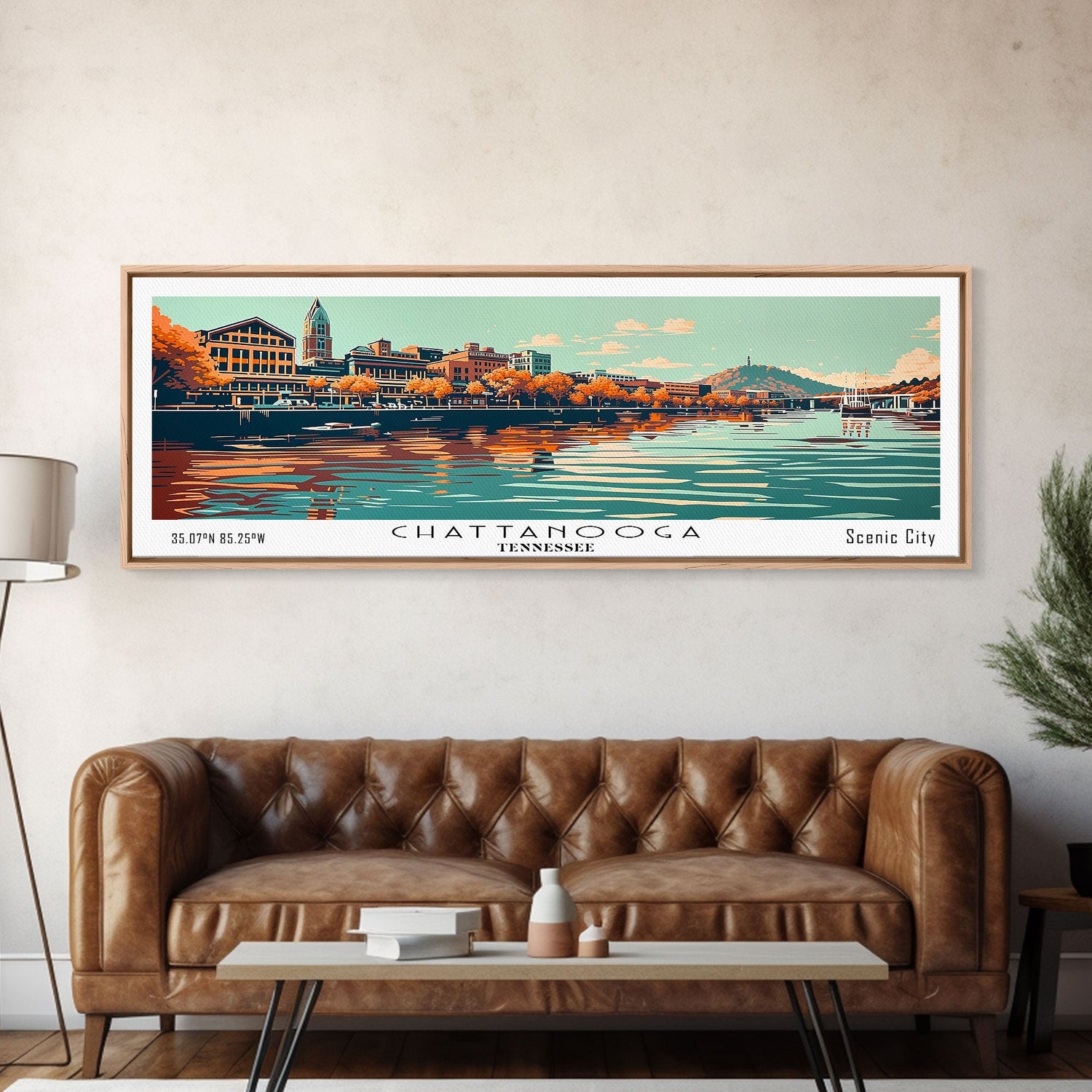Chattanooga Tennessee Panoramic Painting, Framed Canvas Print, Mid Century Modern Wall Art, Retro Pop Art Travel Poster, Office Decor, City Art