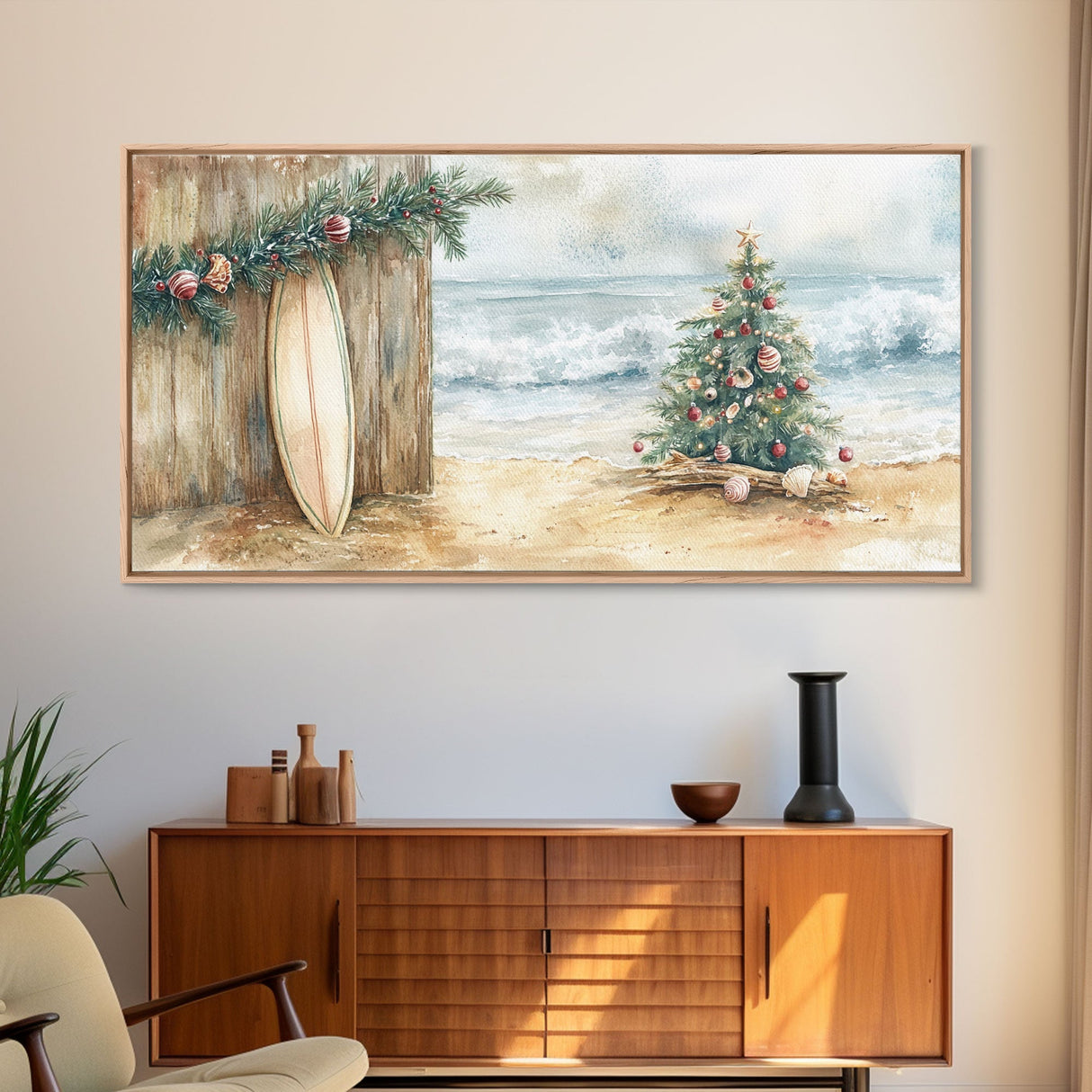 Christmas Tree On Sandy Beach With Surfboard Coastal Decor Framed Canvas Print, Beach Christmas Decor Wall Art