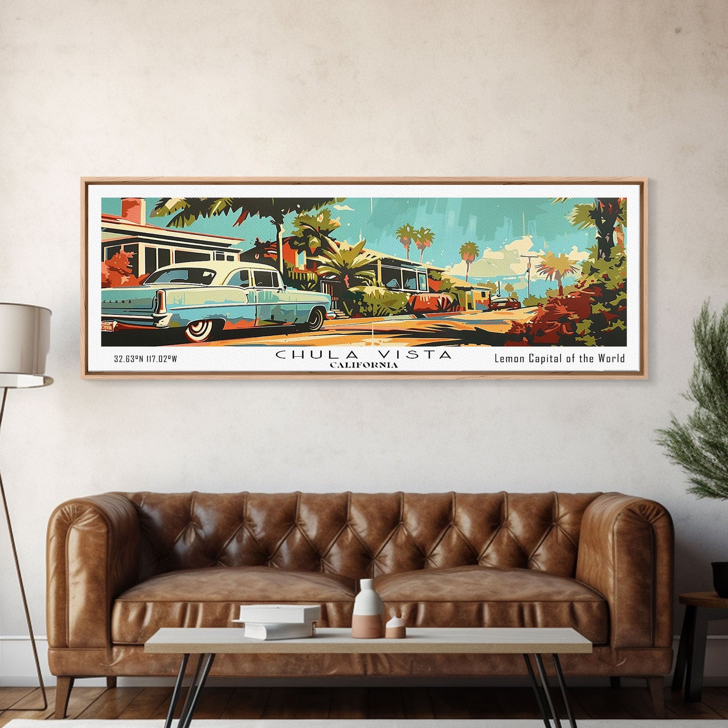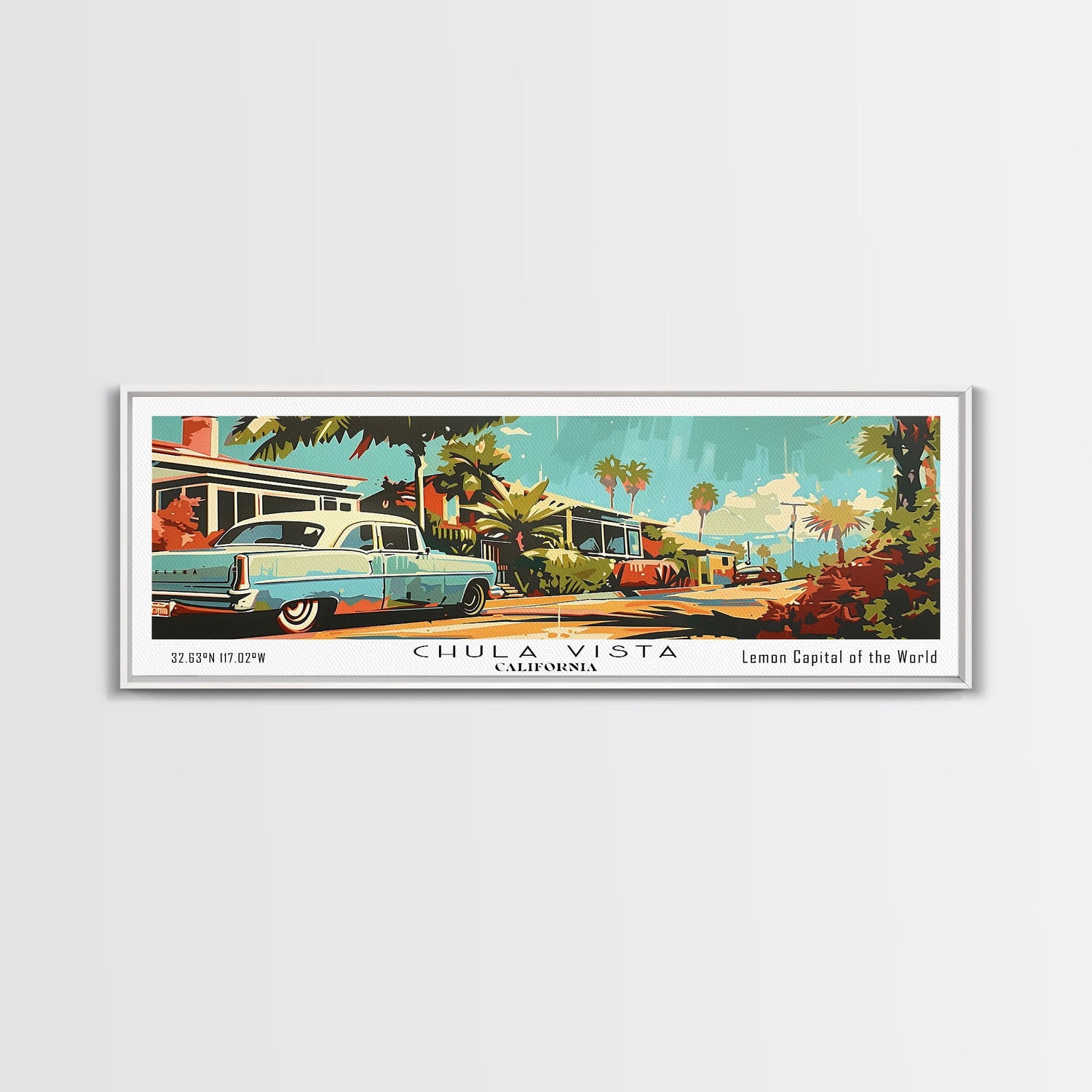 Chula Vista California Panoramic Painting, Mid Century Modern Framed Canvas Print, Retro Pop Art Travel Poster, Wall Decor, Office Art
