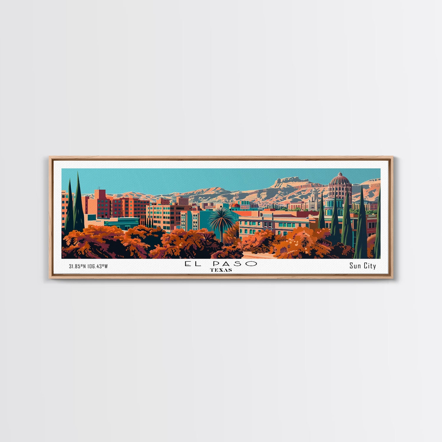 El Paso Texas Panoramic Painting, Framed Canvas Print, Mid Century Modern Wall Art, Retro Pop Art Travel Poster, Home Decor, City Art