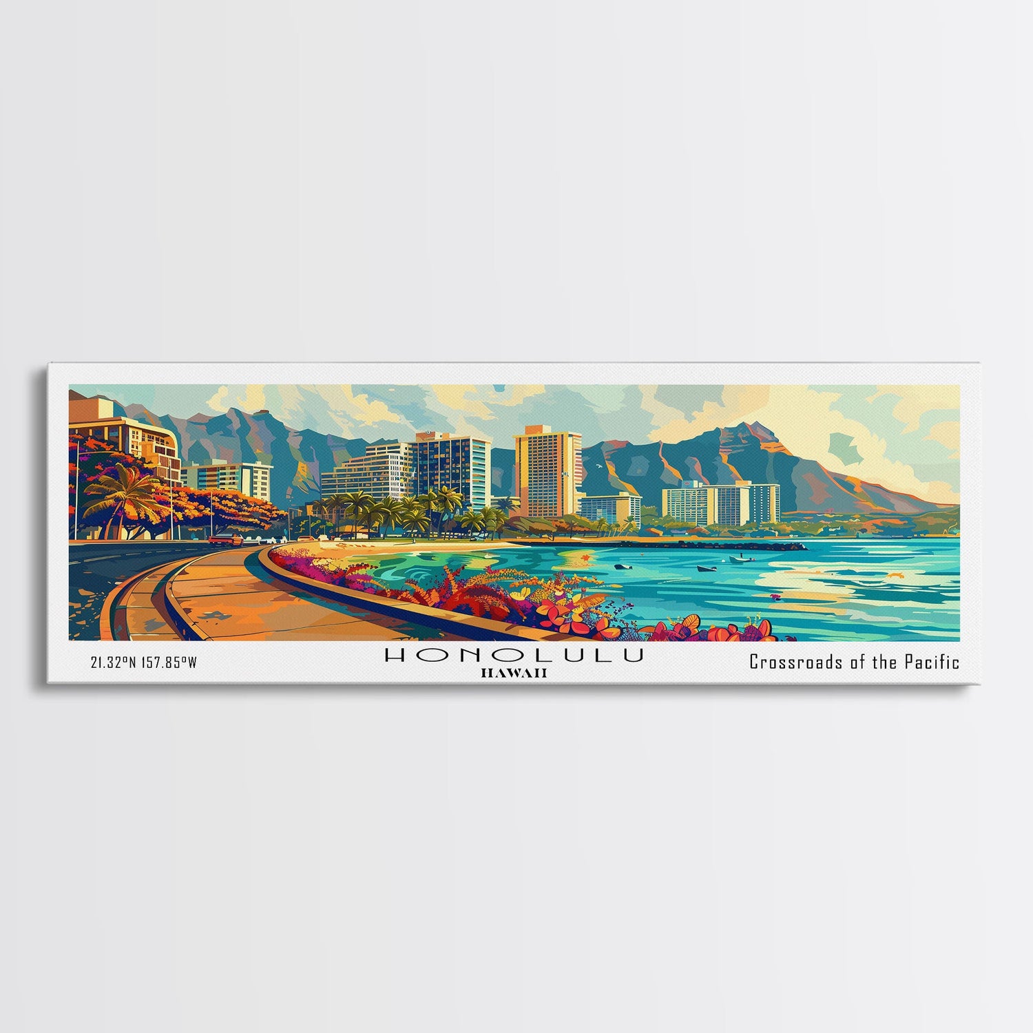 Honolulu Hawaii Panoramic Wall Art Framed Canvas Print, Mid Century Modern Art, Pop Art Style, Travel Poster, Home Decor, Retro Style