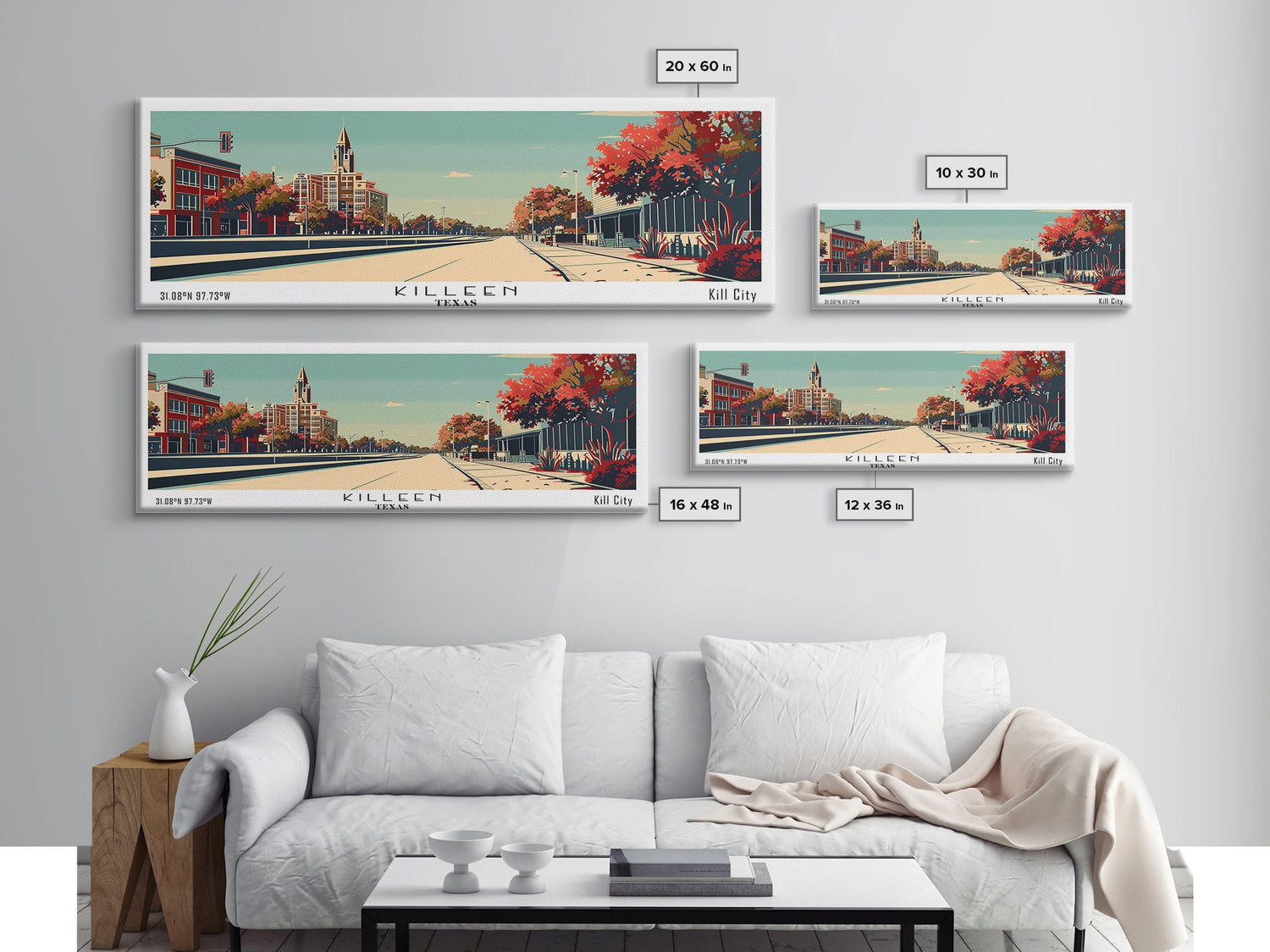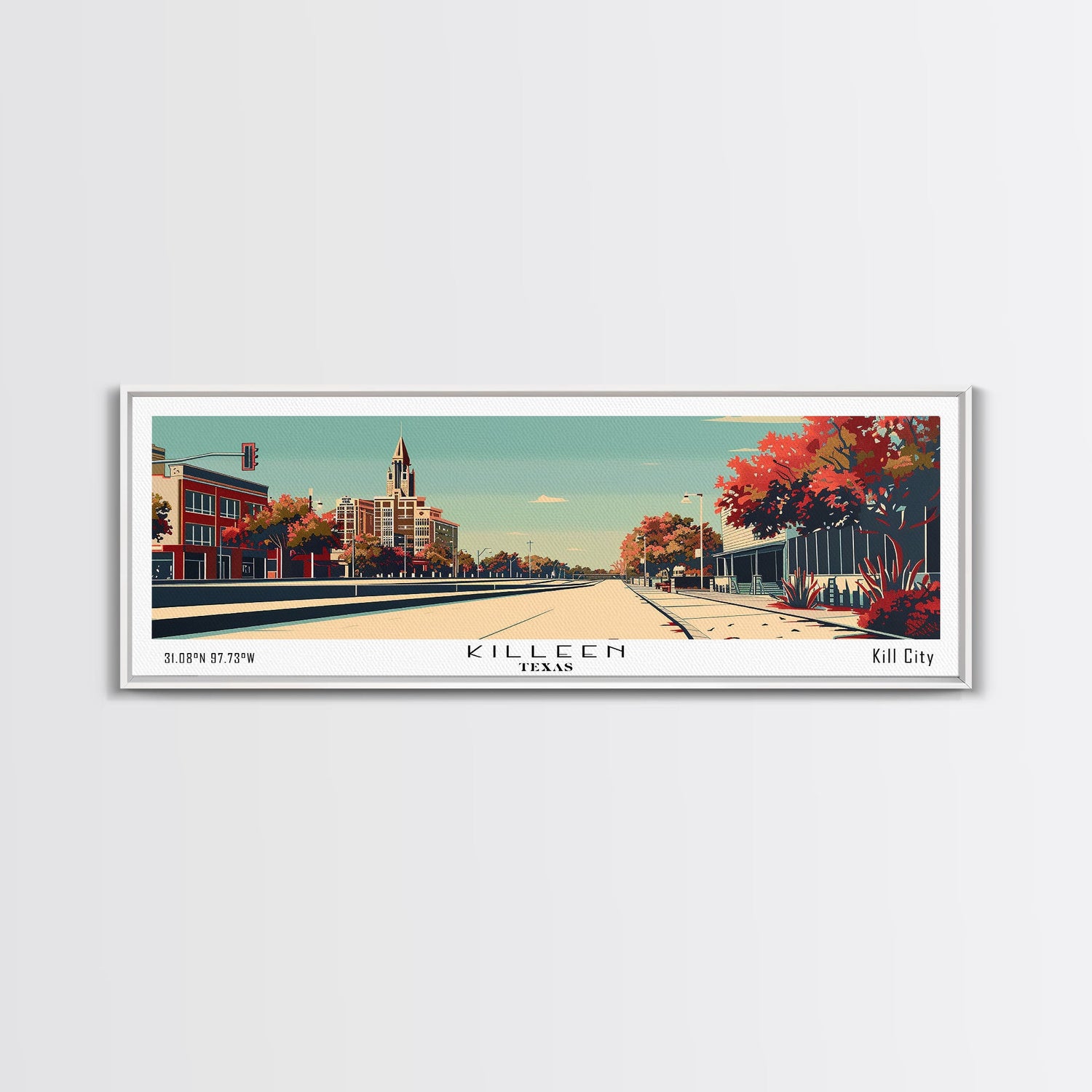 Killeen Texas Panoramic Painting, Mid Century Modern Framed Canvas Print, City Art, Retro Pop Art Travel Poster, Living Room Decor, Office Art, Cityscape Wall Art