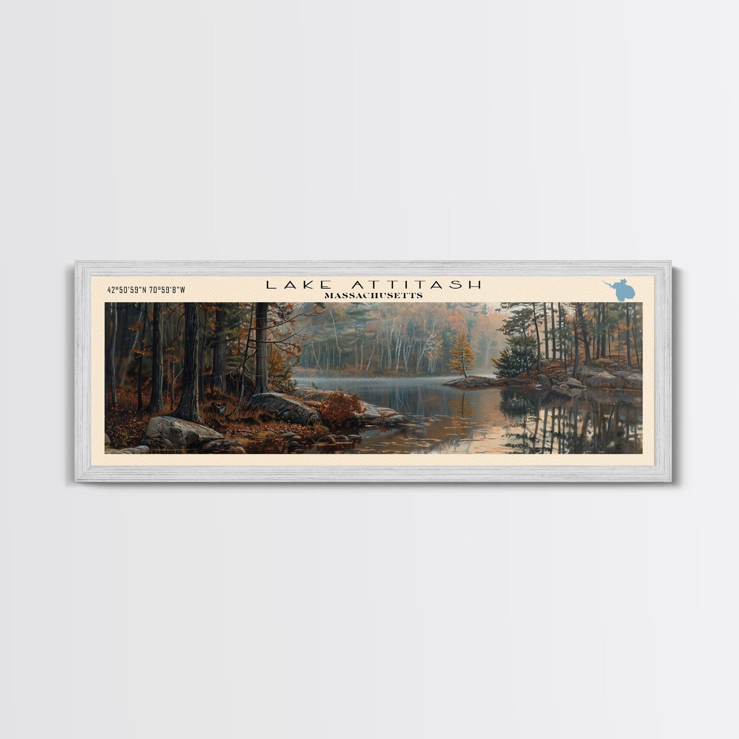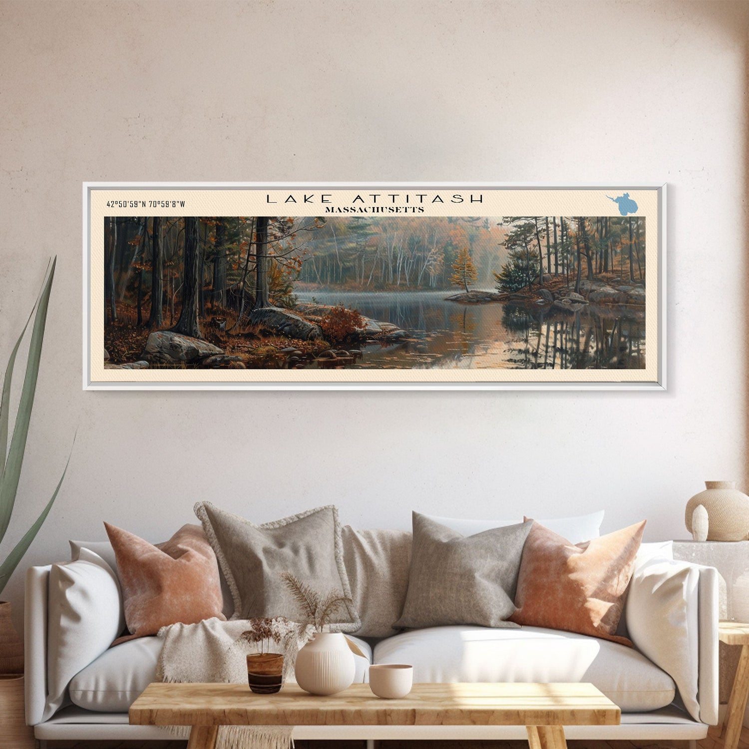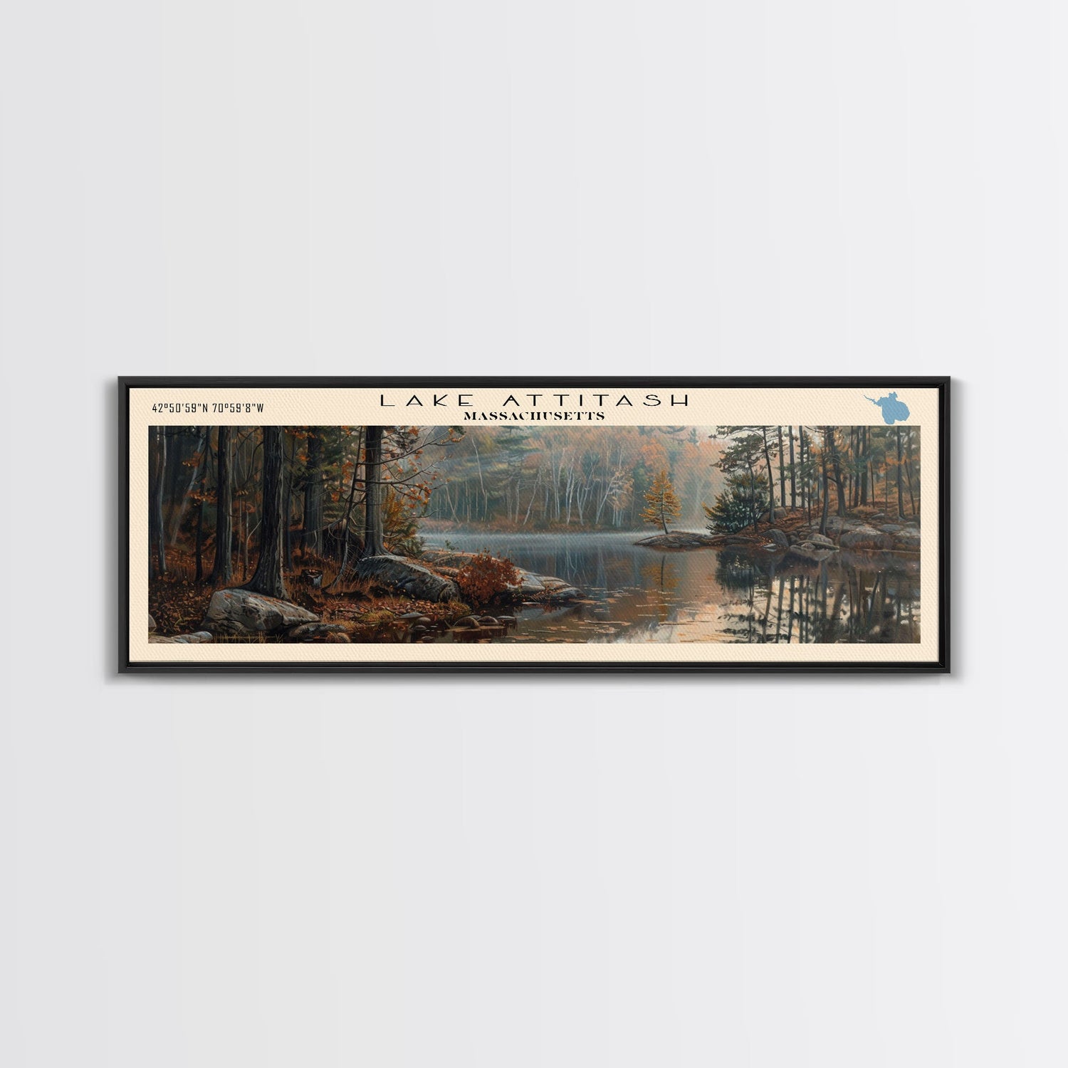 Lake Attitash Massachusetts Framed Canvas Print, Lake House Art, Panoramic Wall Art, Travel Poster, Scenic Lake Painting, Nature Art