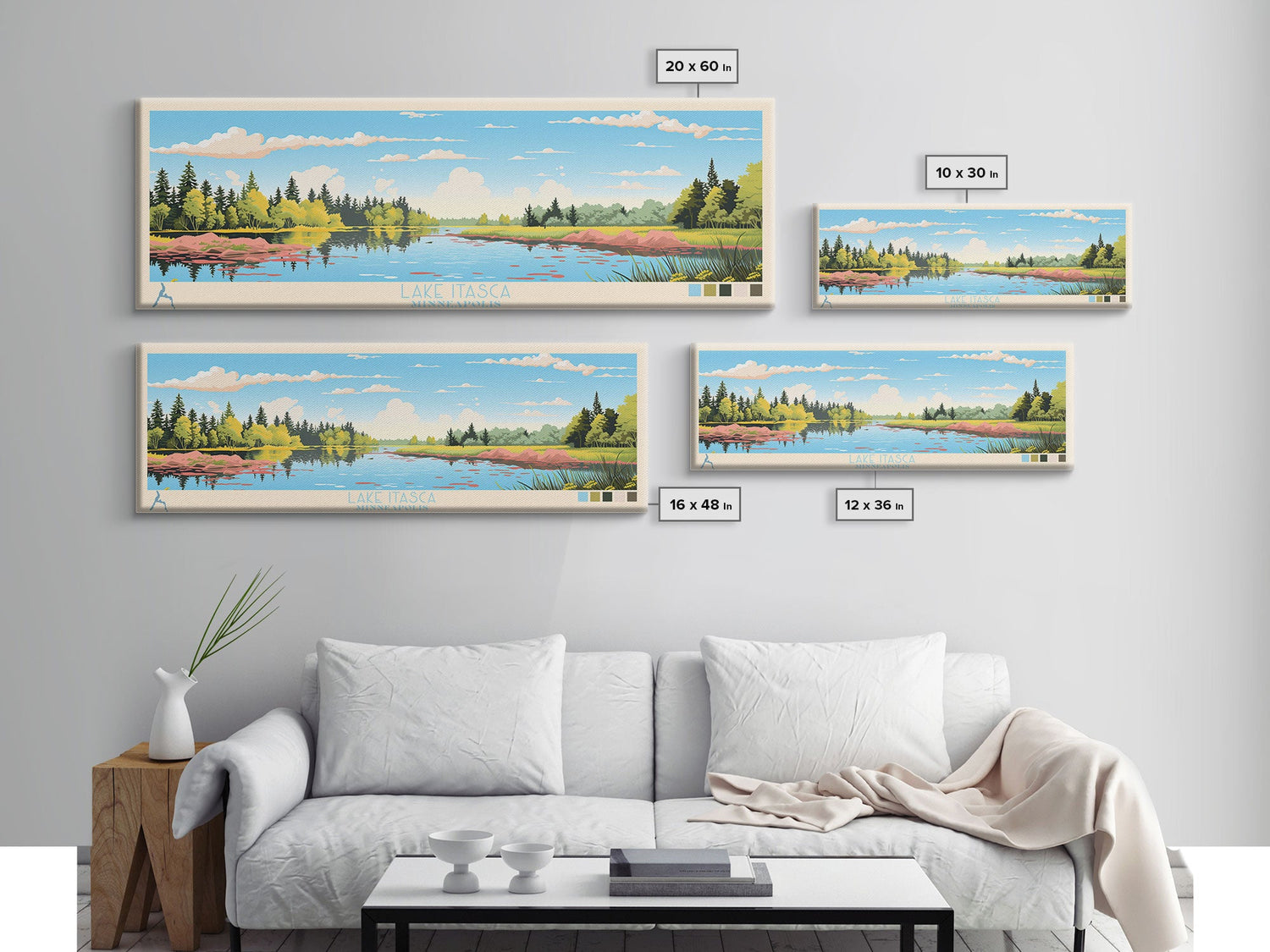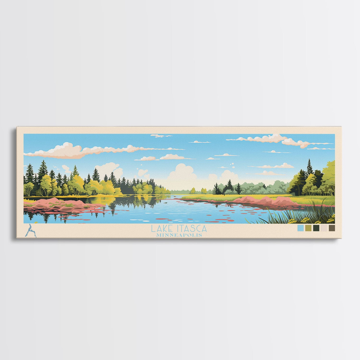 Lake Itasca Minneapolis Framed Canvas Print, Panoramic Wall Art, Midcentury Modern, Pop Art, Lake House Decor, Travel Poster, Bedroom Art