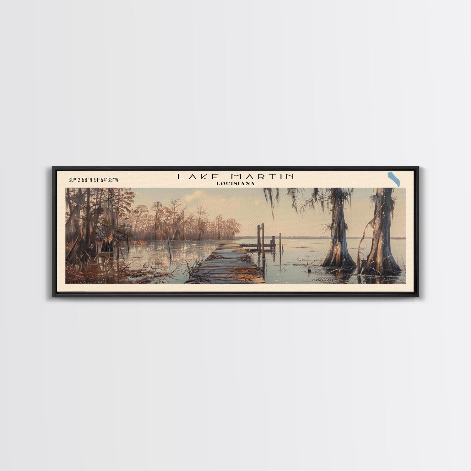 Lake Martin Louisiana Framed Canvas Print, Lake House Decor, Panoramic Wall Art, Travel Poster, Stunning Lake Painting, Rustic Art