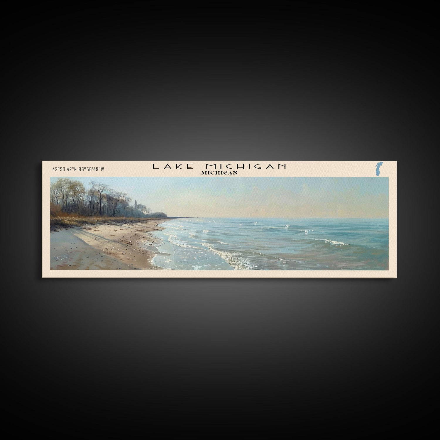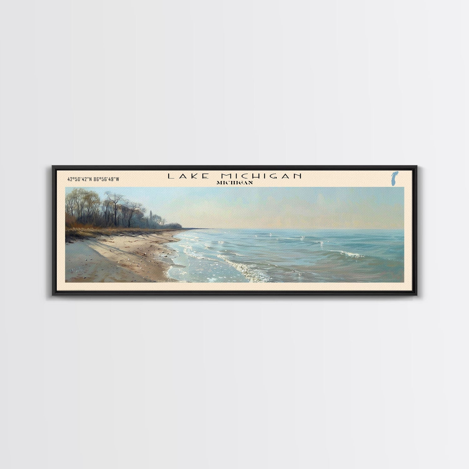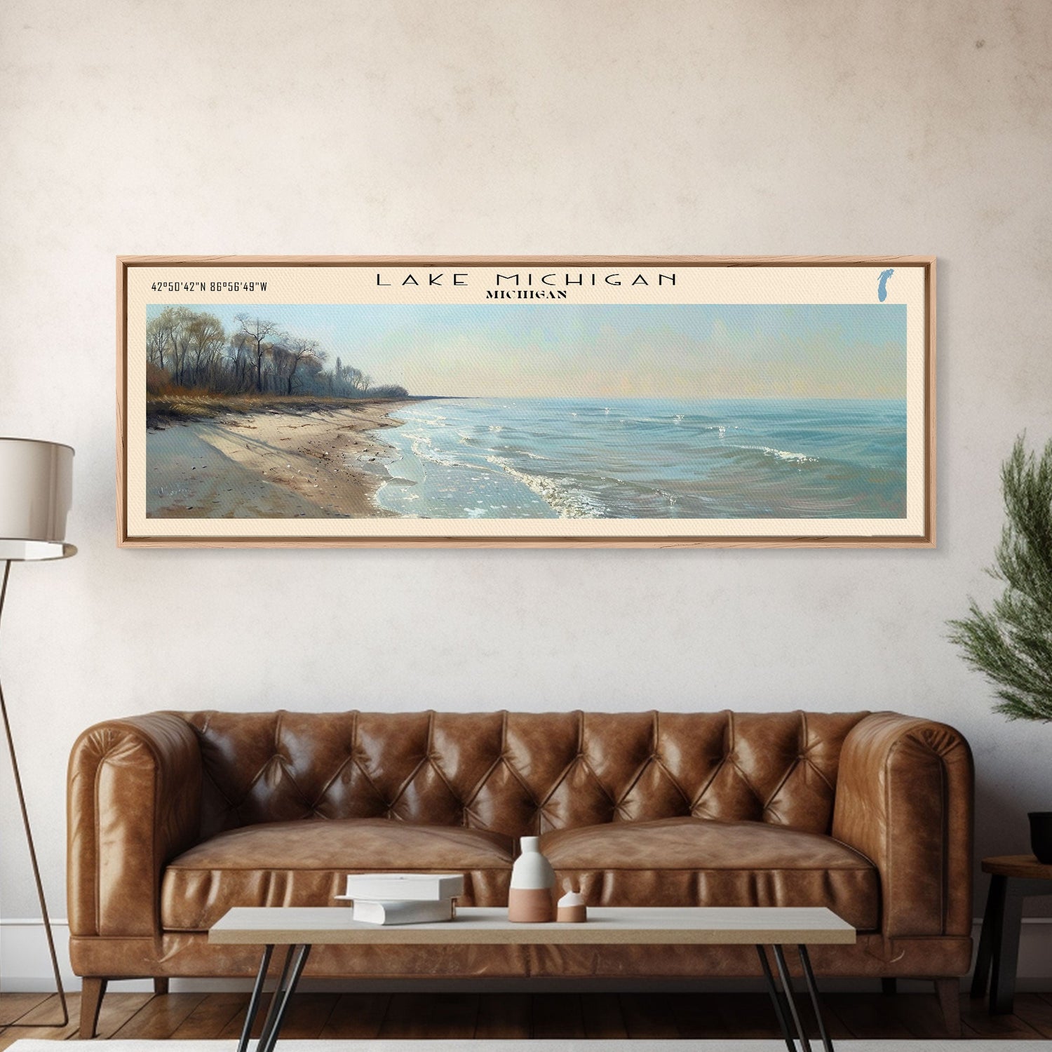 Lake Michigan Framed Canvas Print, Lake House Decor, Panoramic Wall Art, Travel Poster, Beautiful Landscape Painting, Bedroom Decor