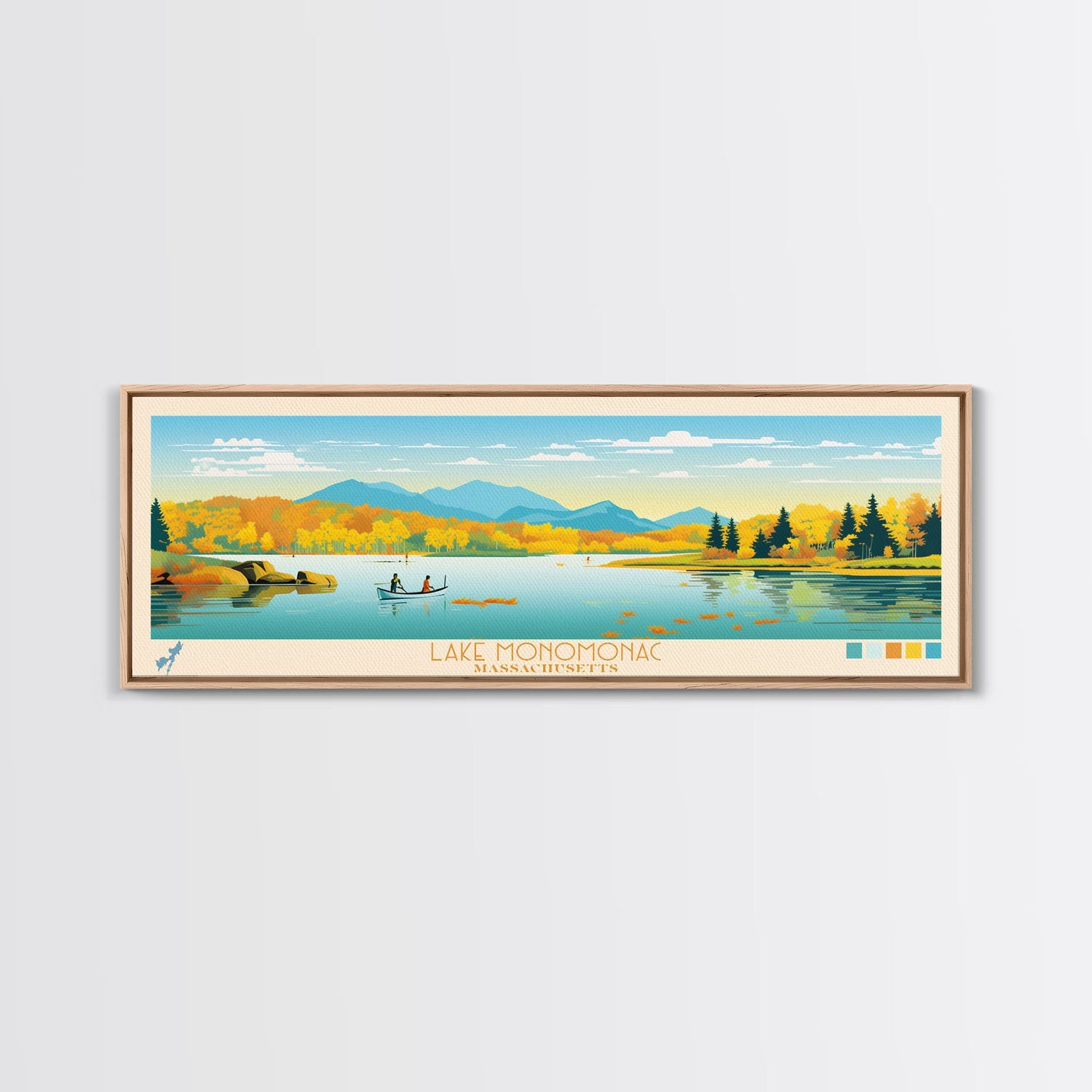 Lake Monomonac Massachusetts Framed Canvas Print, Panoramic Wall Art, Midcentury Modern, Pop Art, Bedroom Art, Travel Poster, Lake House Decor