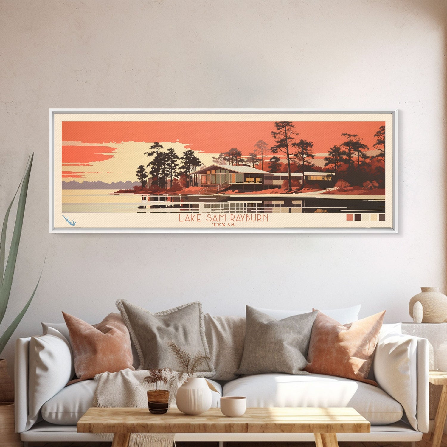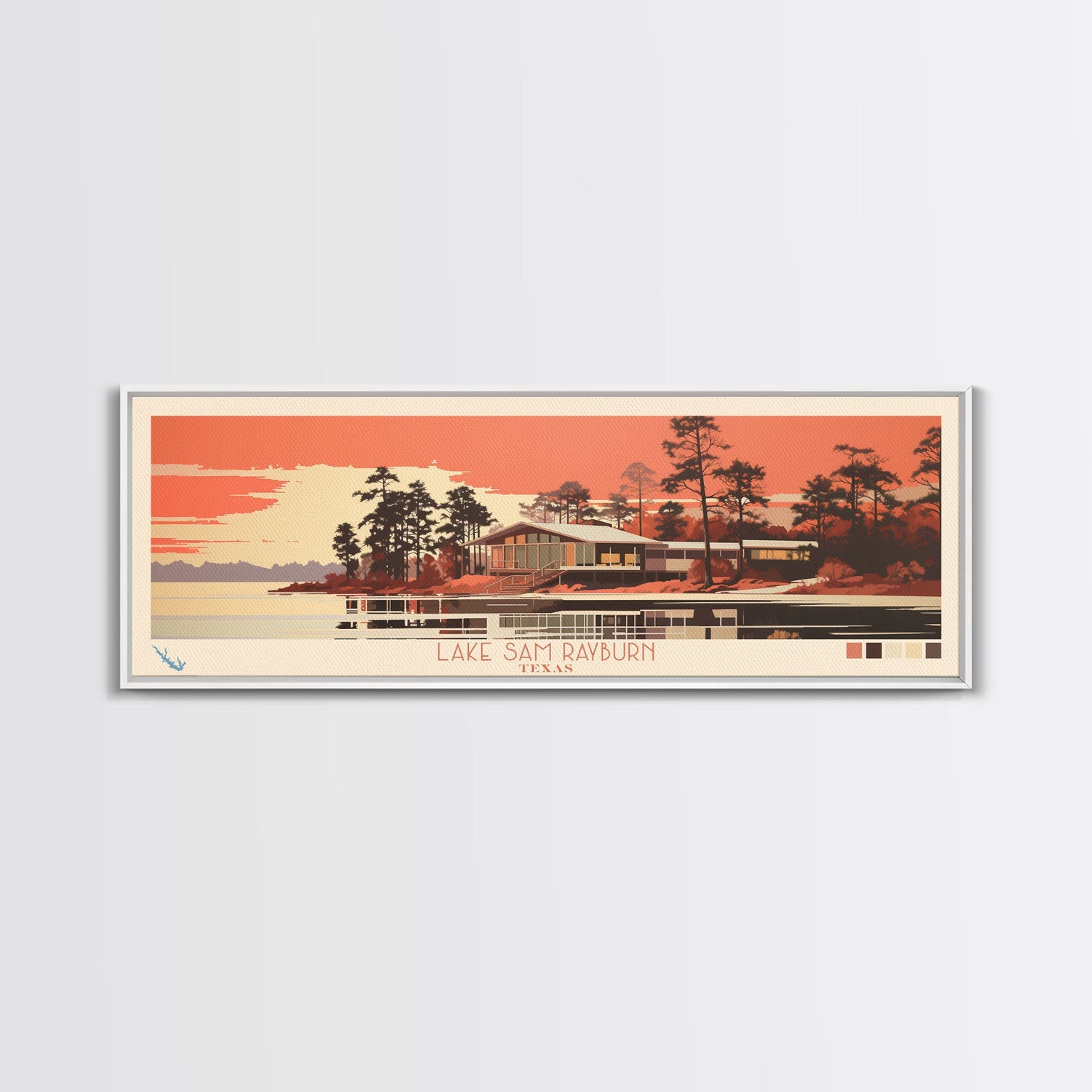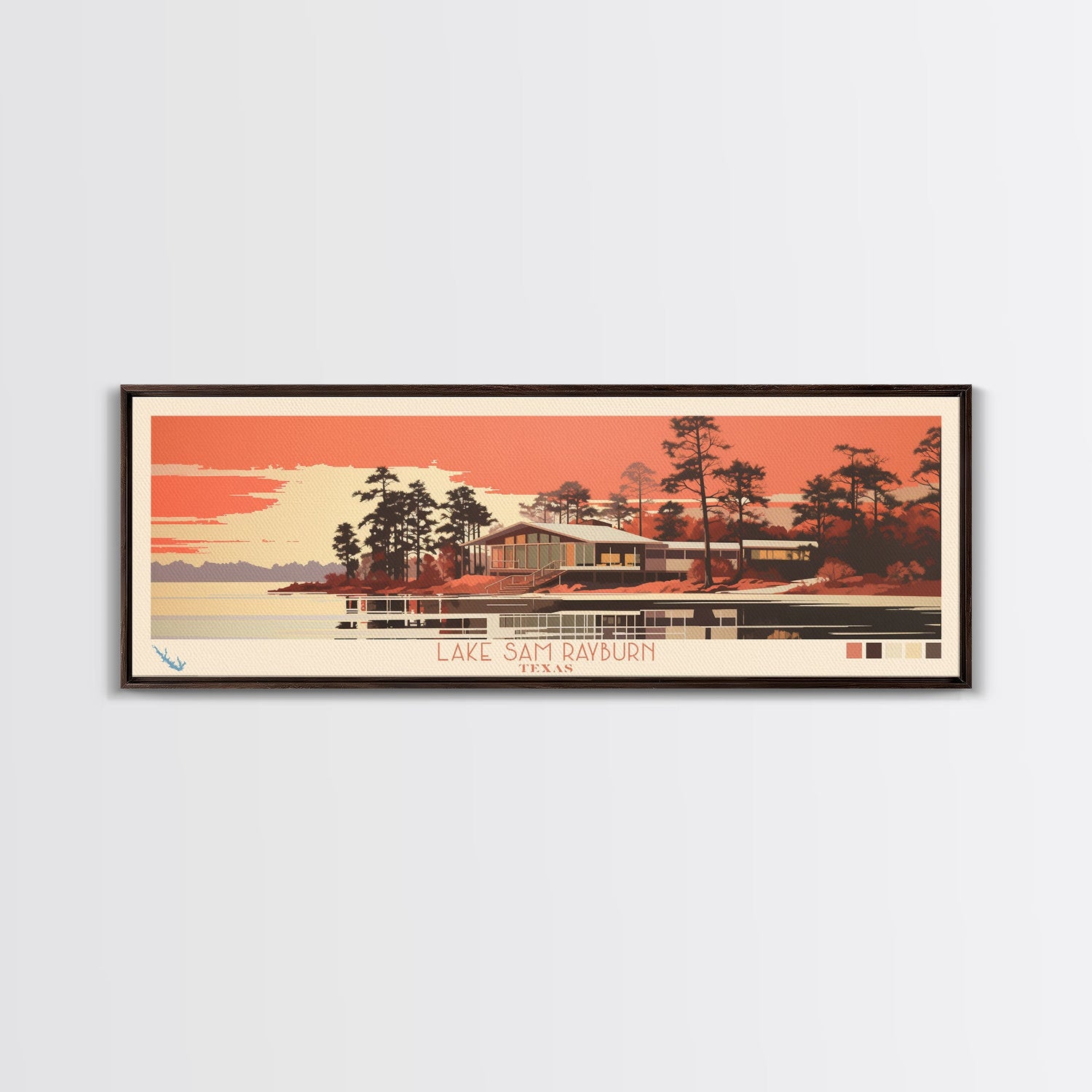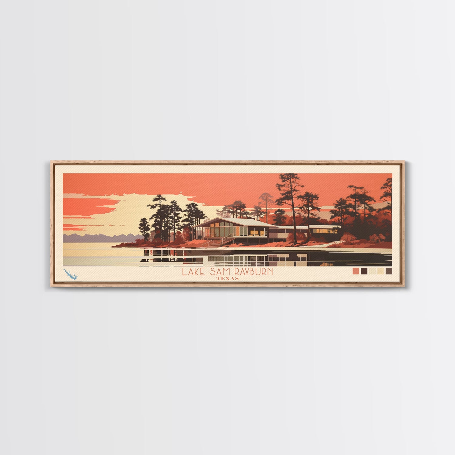 Lake Sam Rayburn Texas Framed Canvas Print, Panoramic Wall Art, Midcentury Modern, Pop Art, Living Room Decor, Travel Poster, Lake House Art