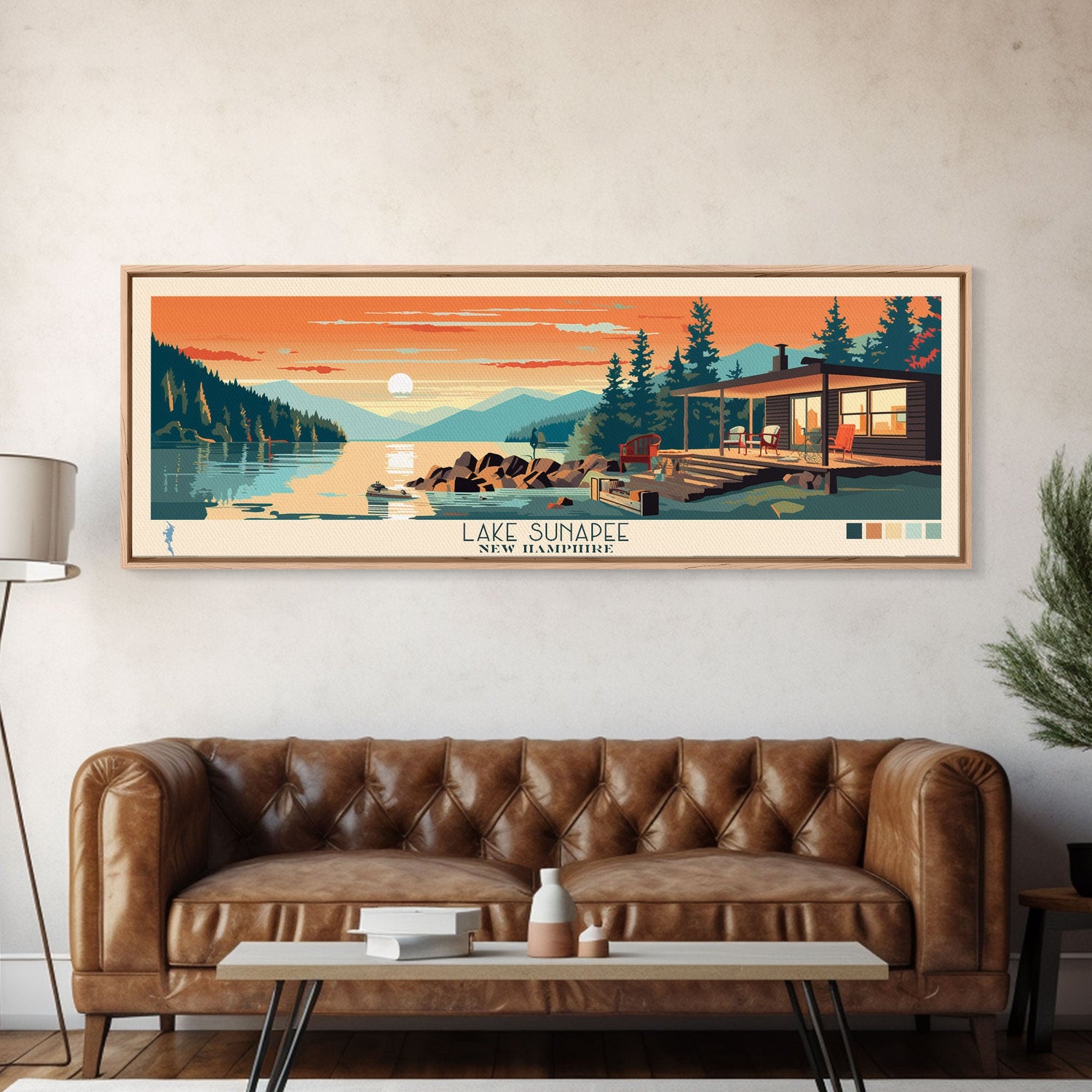 Lake Sunapee New Hamphire Framed Canvas Print, Panoramic Wall Art, Midcentury Modern, Pop Art, Bedroom Art, Travel Poster, Lake House Decor