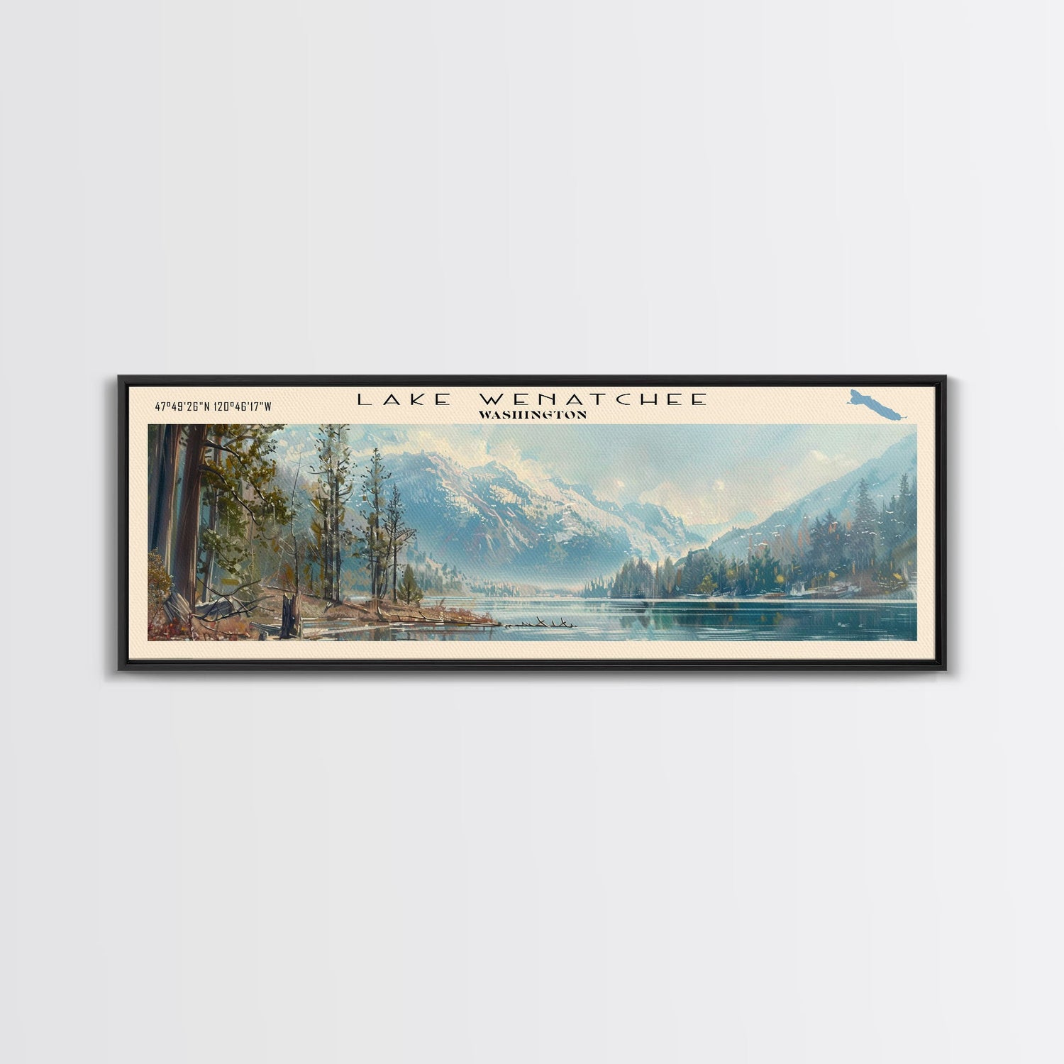 Lake Wenatchee Washington Framed Canvas Print, Lake House Decor, Panoramic Wall Art, Travel Poster, Landscape Painting, Contemporary Art