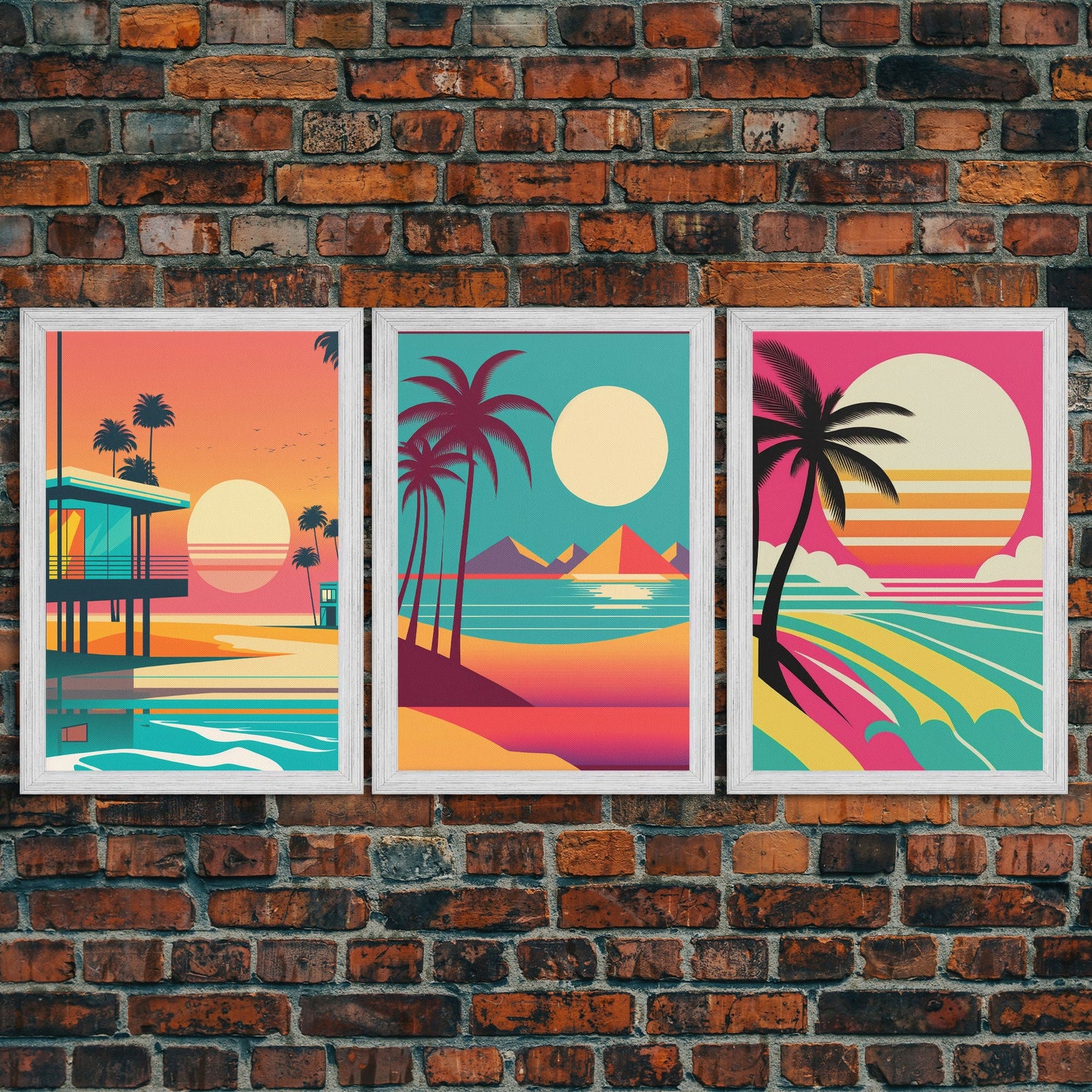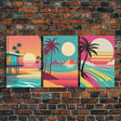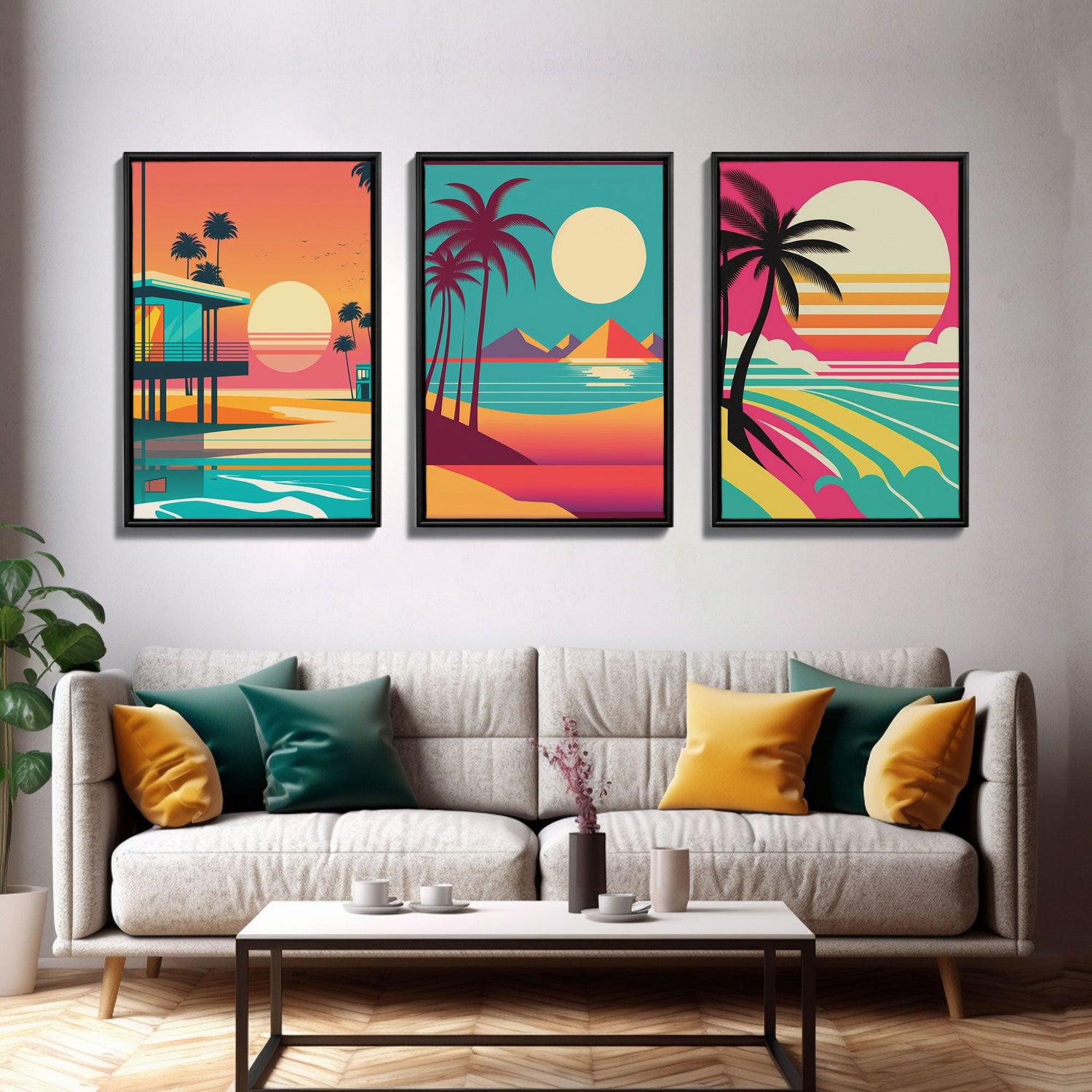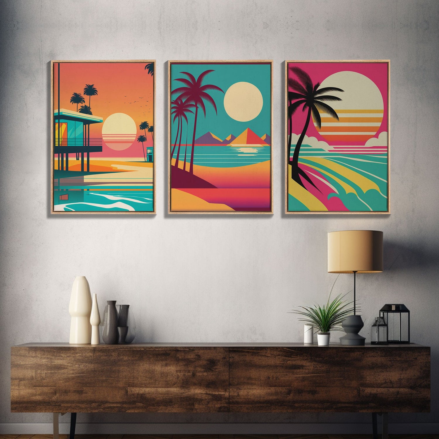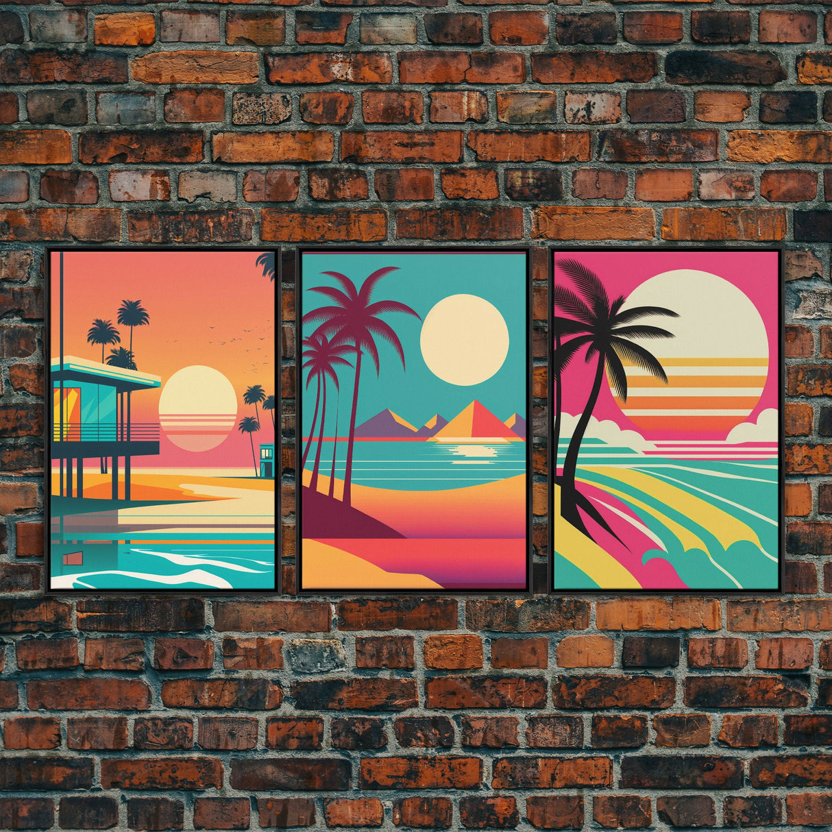 Midcentury / At Deco / Vaporwave mashup, Palm Trees & Beach Art, Framed Canvas Prints, 3 Panel Triptych Art, 80s Vibes