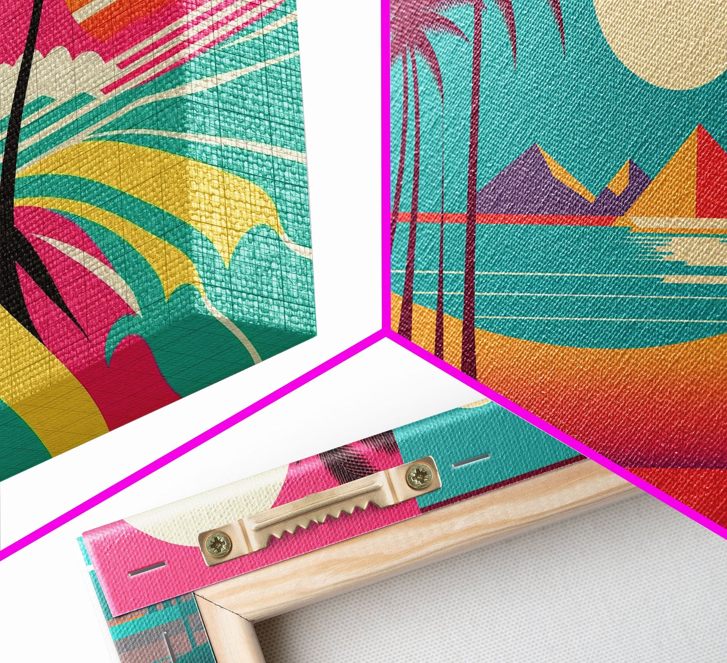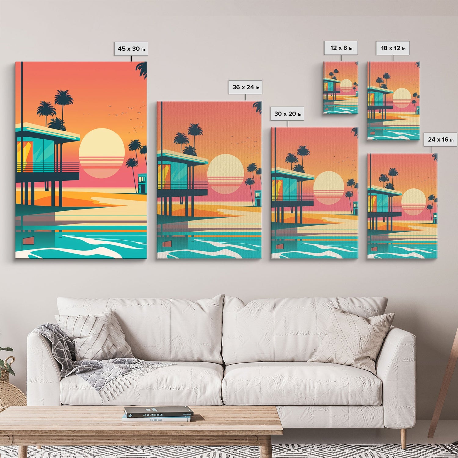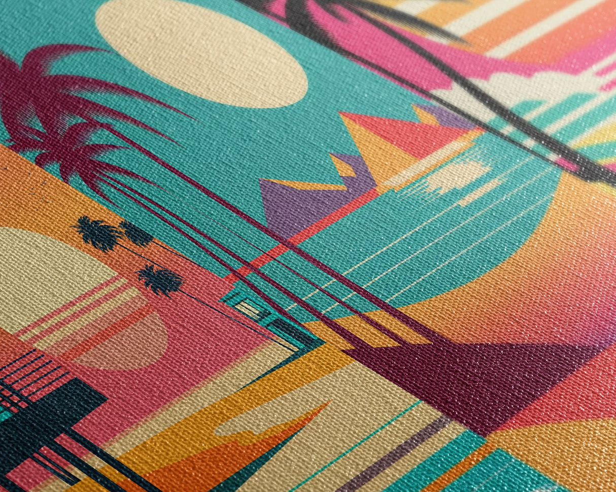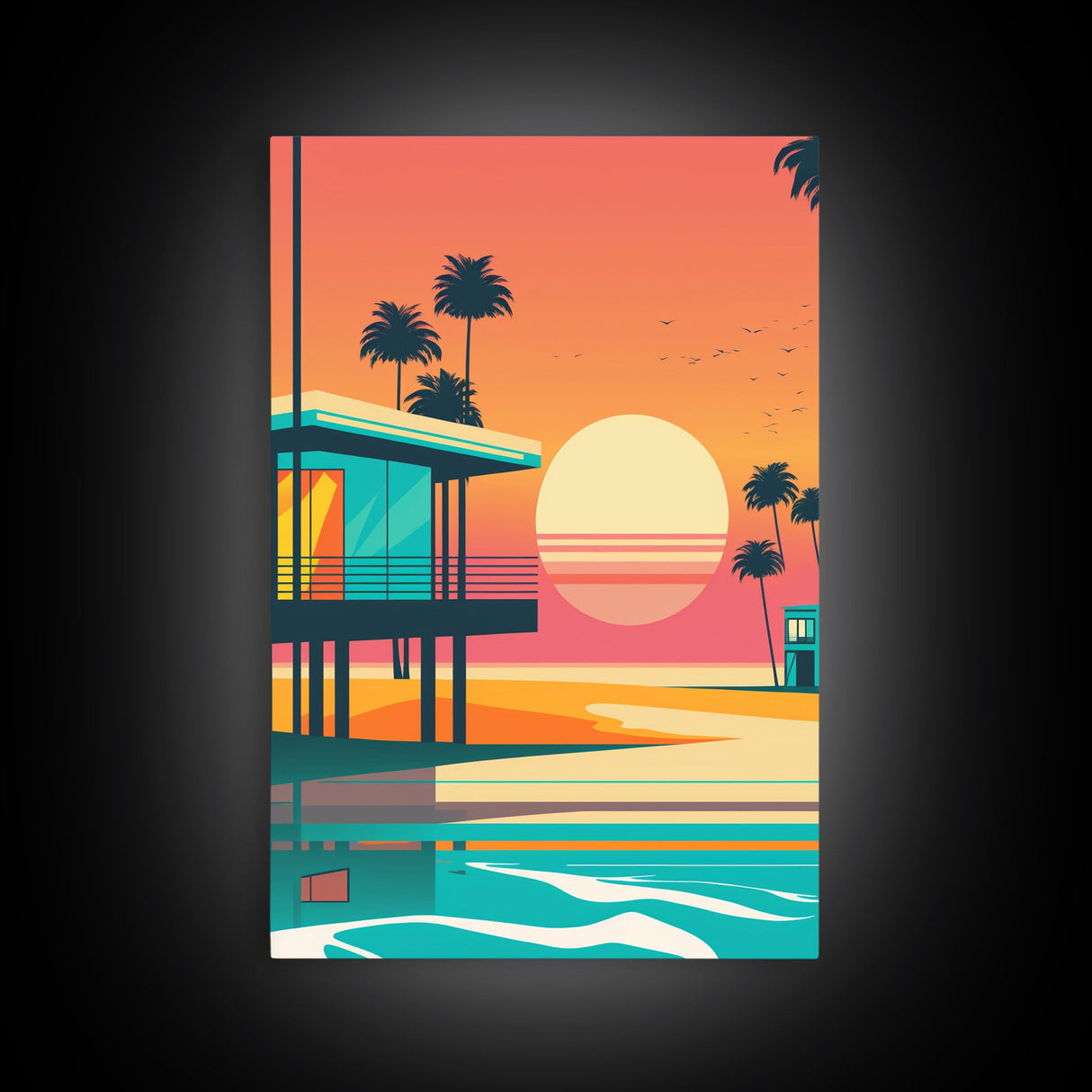 Midcentury / At Deco / Vaporwave mashup, Palm Trees & Beach Art, Framed Canvas Prints, 3 Panel Triptych Art, 80s Vibes