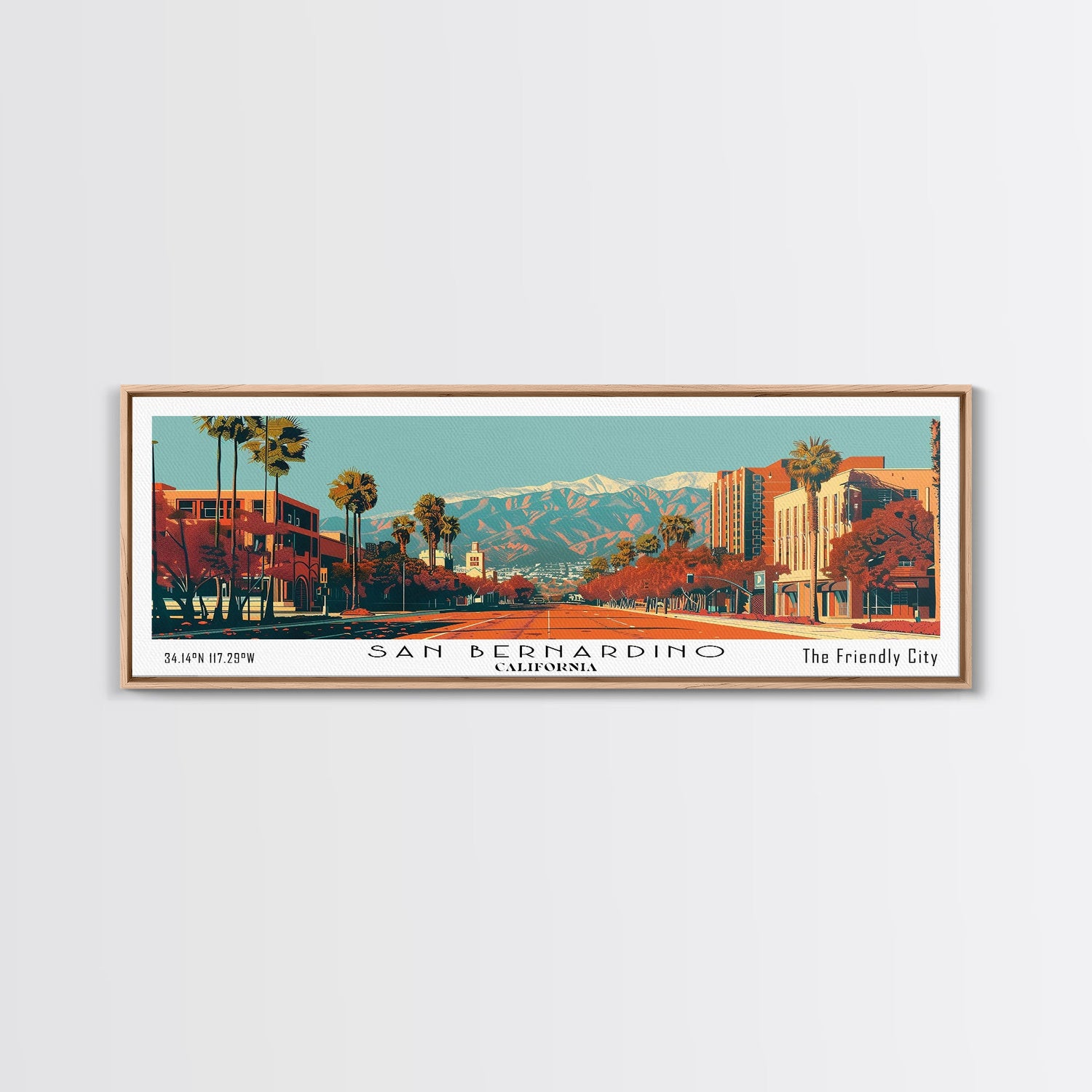 San Bernardino California Panoramic Wall Art, Mid Century Modern Framed Canvas Print, Retro Pop Art Cityscape, Travel Poster, Living Room Decor