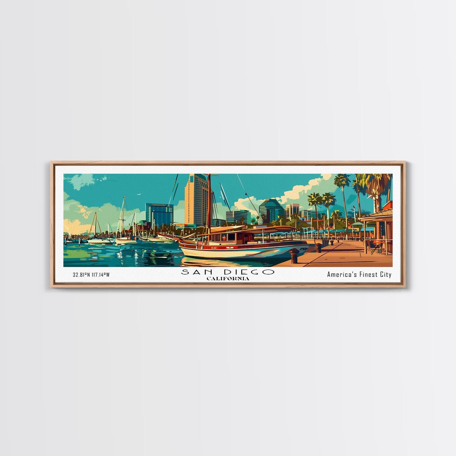 San Diego California Panoramic Painting, Retro Style Framed Canvas Print, Mid Century Modern Wall Art, Pop Art Travel Poster