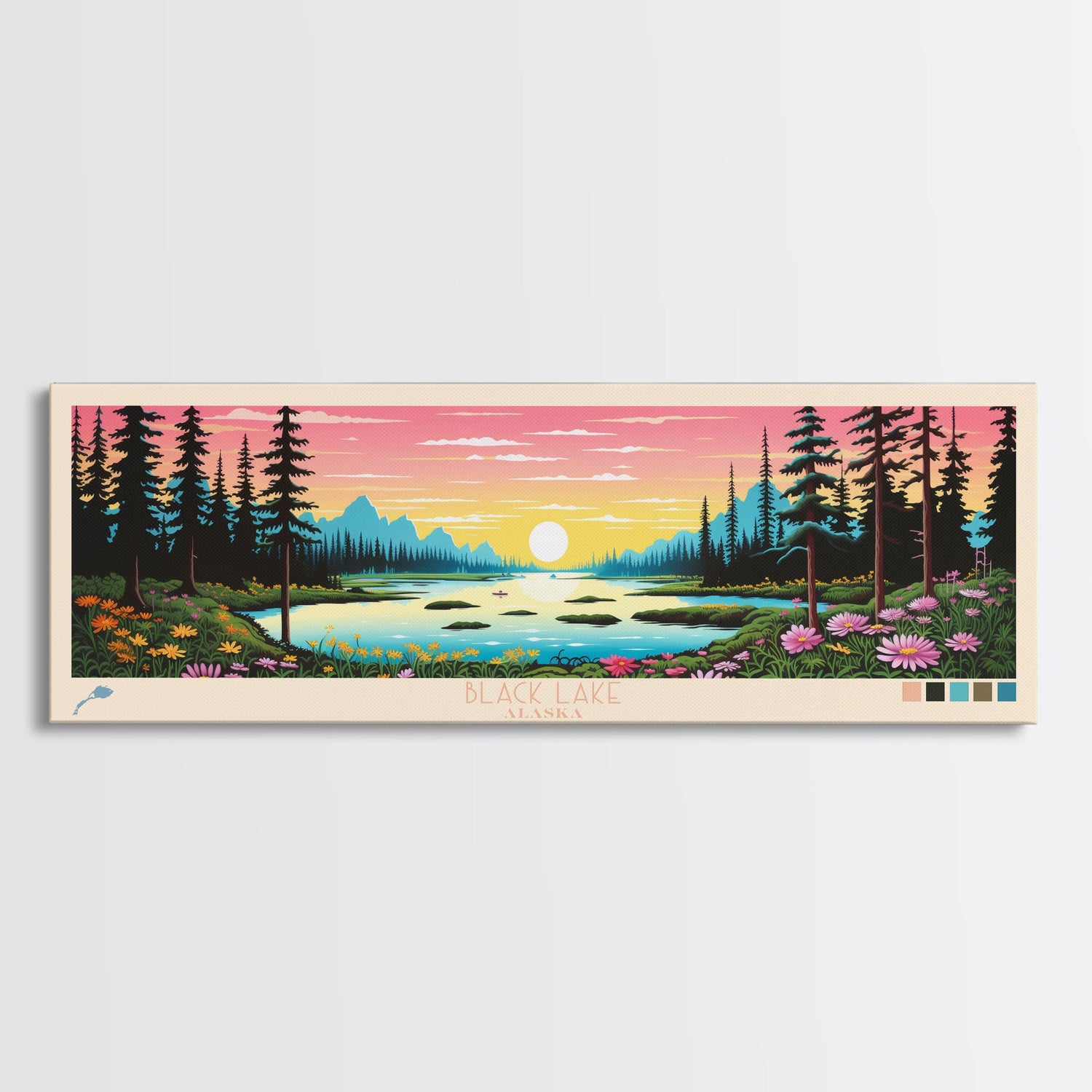 Black Lake Southwest Alaska Framed Canvas Print, Panoramic Travel Poster, Midcentury Modern Wall Art, Pop Art, Nature Bedroom Decor, Scenic Lake House Art