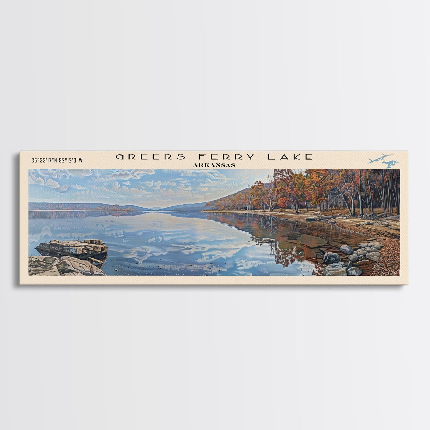 Greers Ferry Lake Arkansas Framed Canvas Print, Panoramic Lake House Decor, Wall Art, Travel Poster, Beautiful Lake Painting, Nature Art