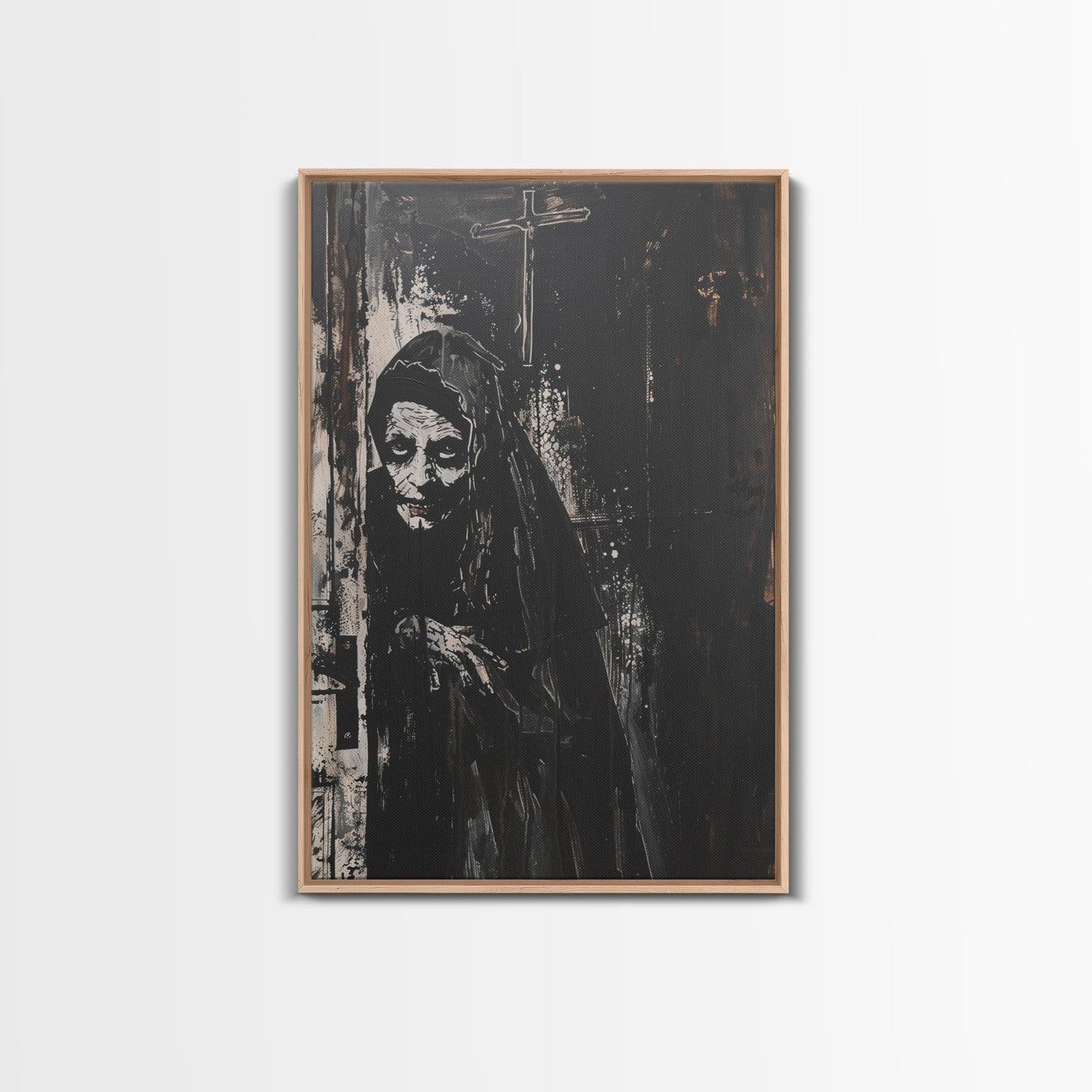 Haunted Nun with Eerie Expression, Framed Canvas Print, Gothic Halloween Art, Spooky Religious Decor, Scary Nun Painting, Gothic Home Art