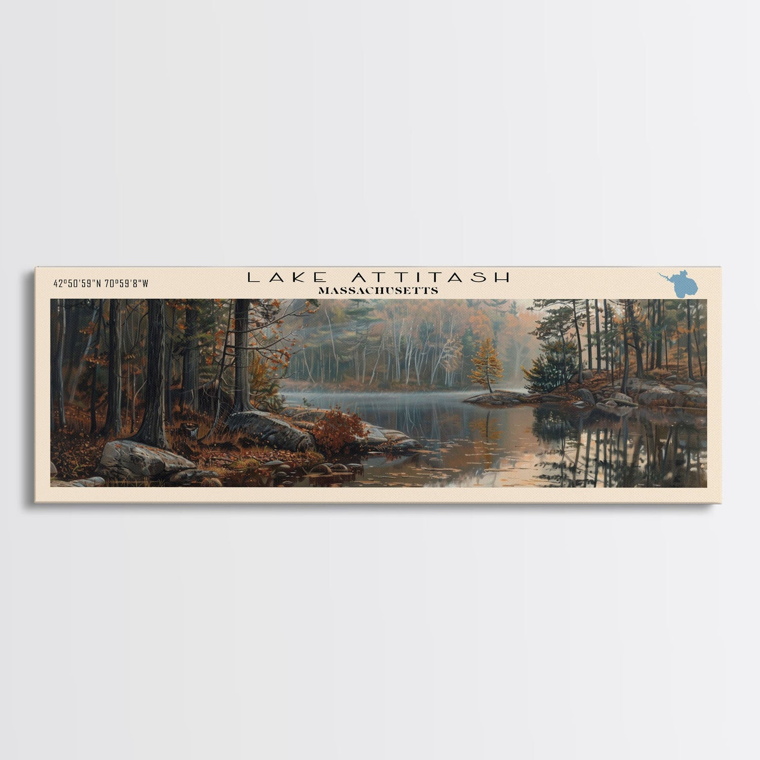 Lake Attitash Massachusetts Framed Canvas Print, Lake House Art, Panoramic Wall Art, Travel Poster, Scenic Lake Painting, Nature Art