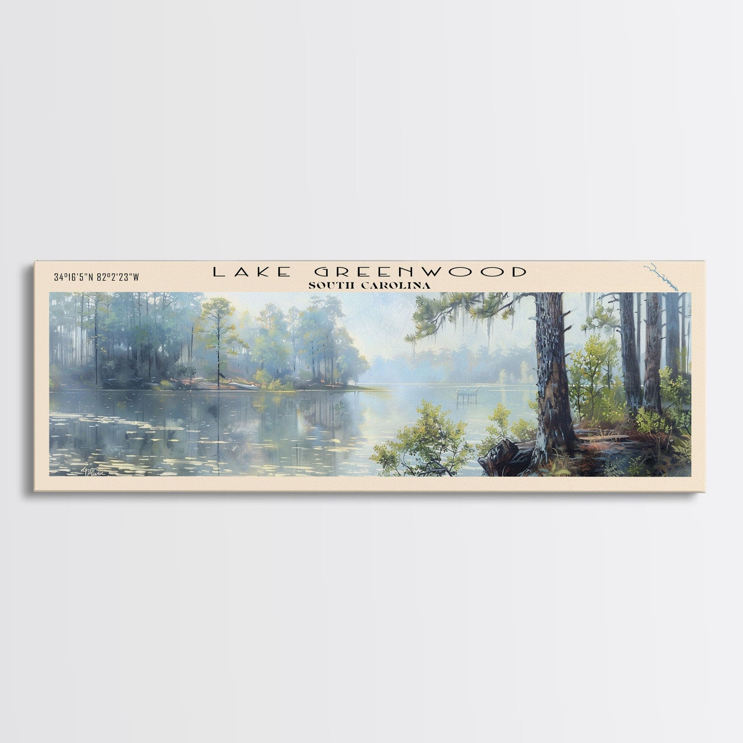 Lake Greenwood South Carolina Framed Canvas Print, Lake House Decor, Panoramic Wall Art, Travel Poster, Scenic Landscape Painting, Nature Art