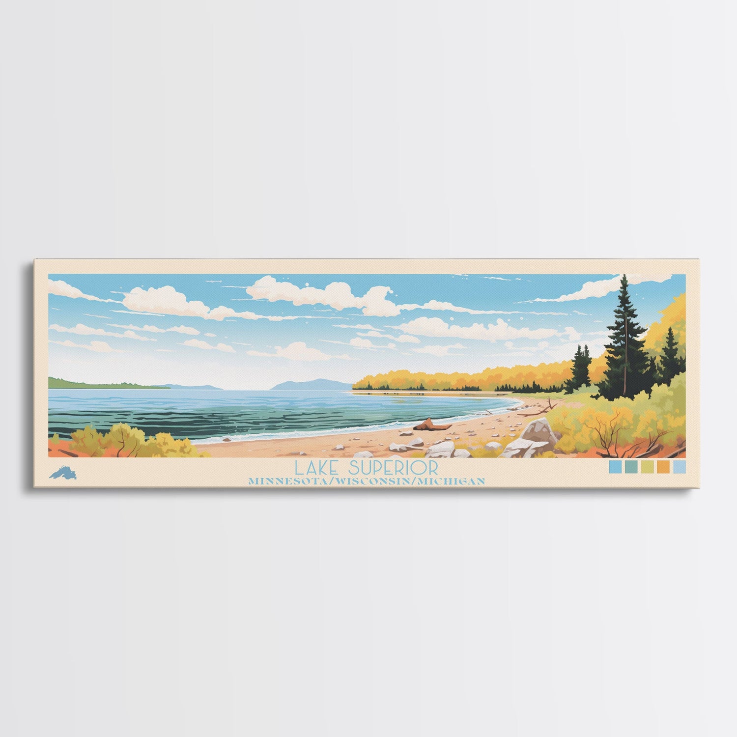 Lake Superior MinnesotaWisconsinMichigan Framed Canvas Print, Panoramic Wall Art, Midcentury Modern, Pop Art, Living Room Decor, Travel Poster, Lake House Art