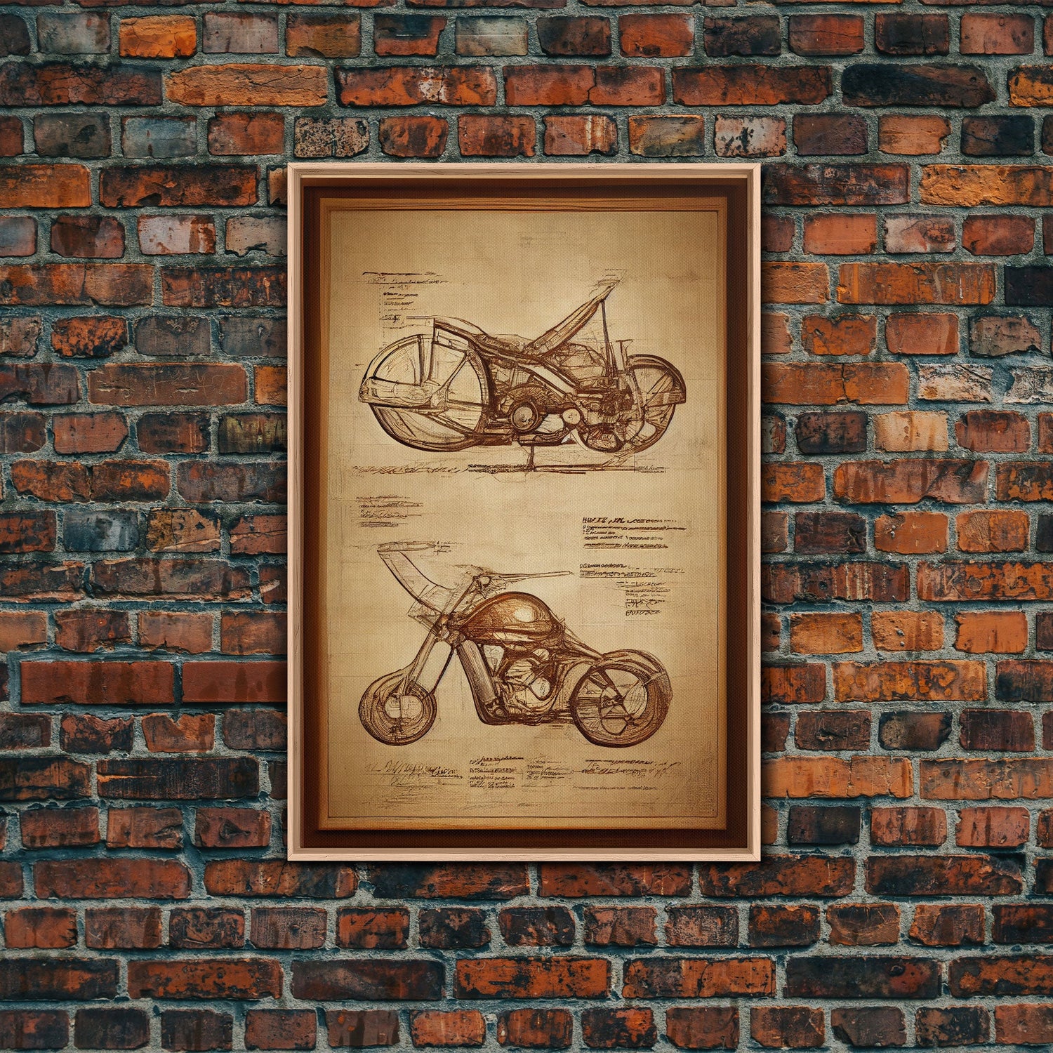 Steampunk motorcycle diagram wall art, canvas print, mancave decor, Da Vinci style diagram motorcycle art, abstract man cave art