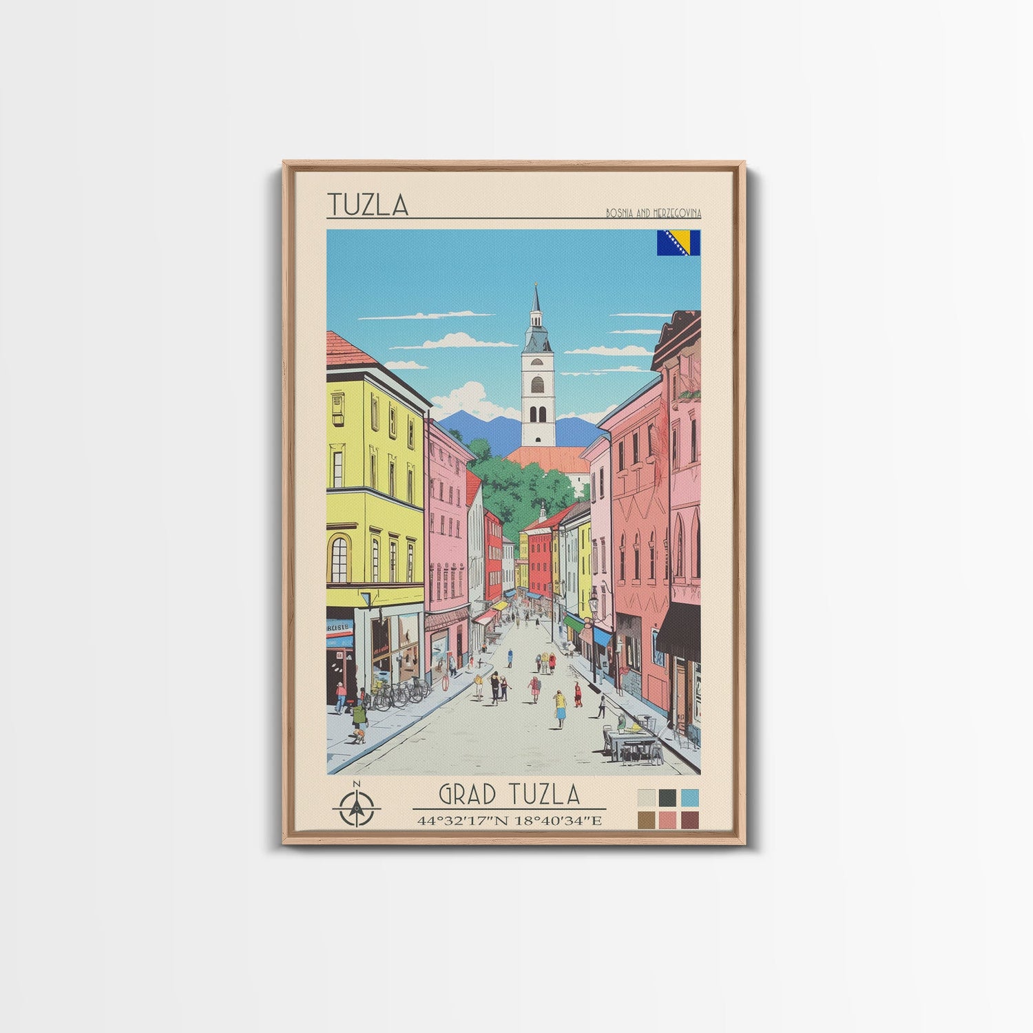 Tuzla Bosnia Travel Poster Framed Canvas Print, Midcentury Modern Art, Pop Art Wall Decor, Living Room Art, Vacation Gift