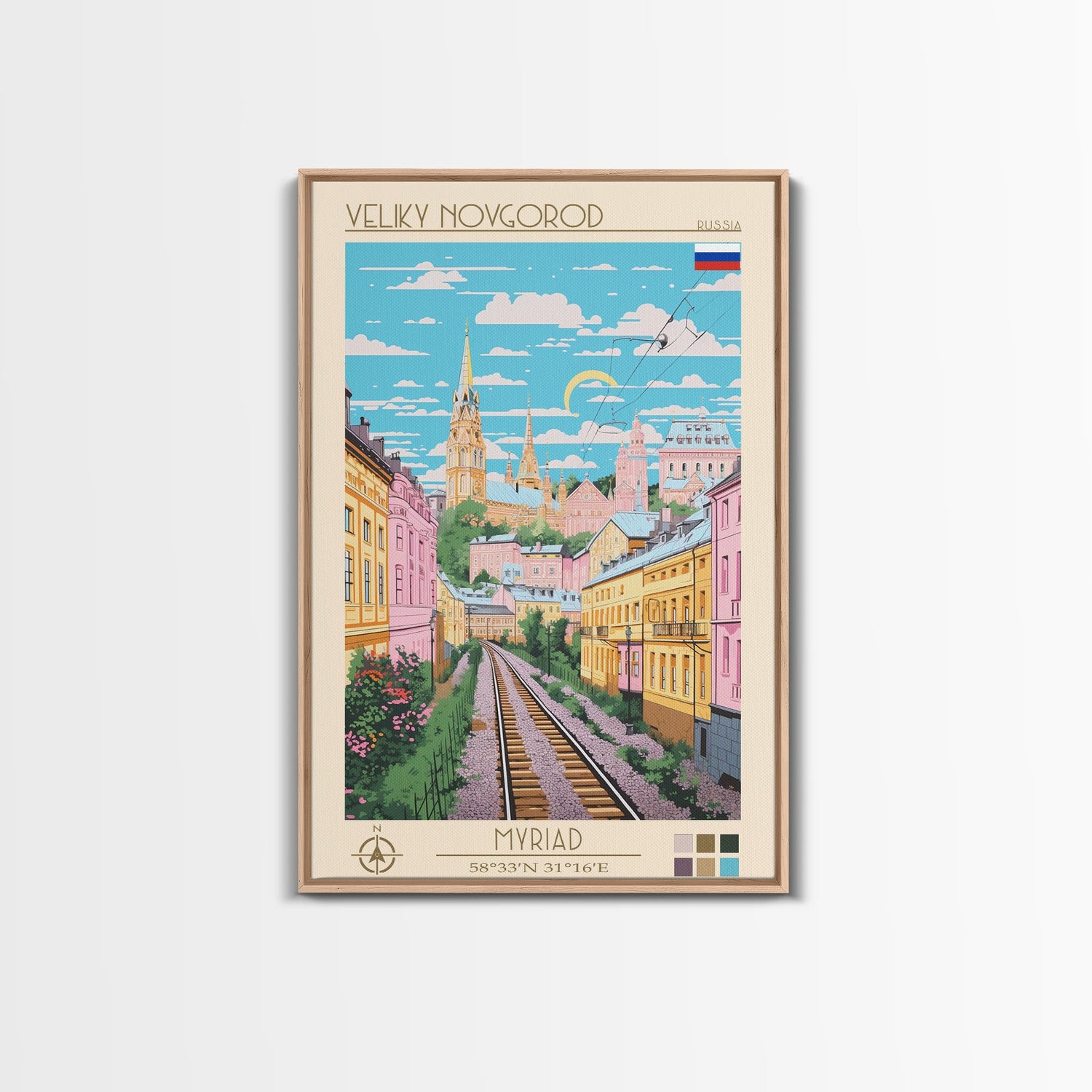 Veliky Novgorod Russia Travel Poster Framed Canvas Print, Midcentury Modern Art, Pop Art Wall Decor, Living Room Art, Scenic Wall Art