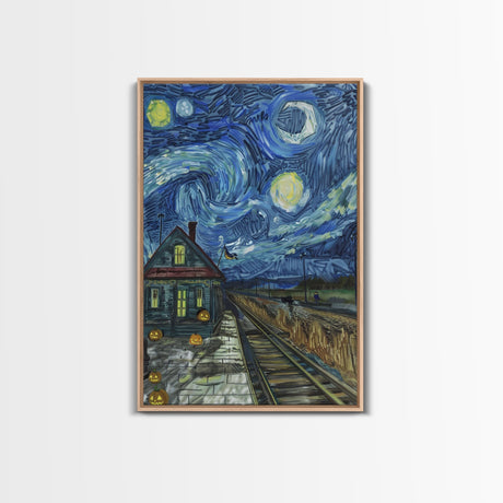 Starry Night Inspired Haunted Ghostly Docks At Night, Framed Canvas Print, Halloween Decor
