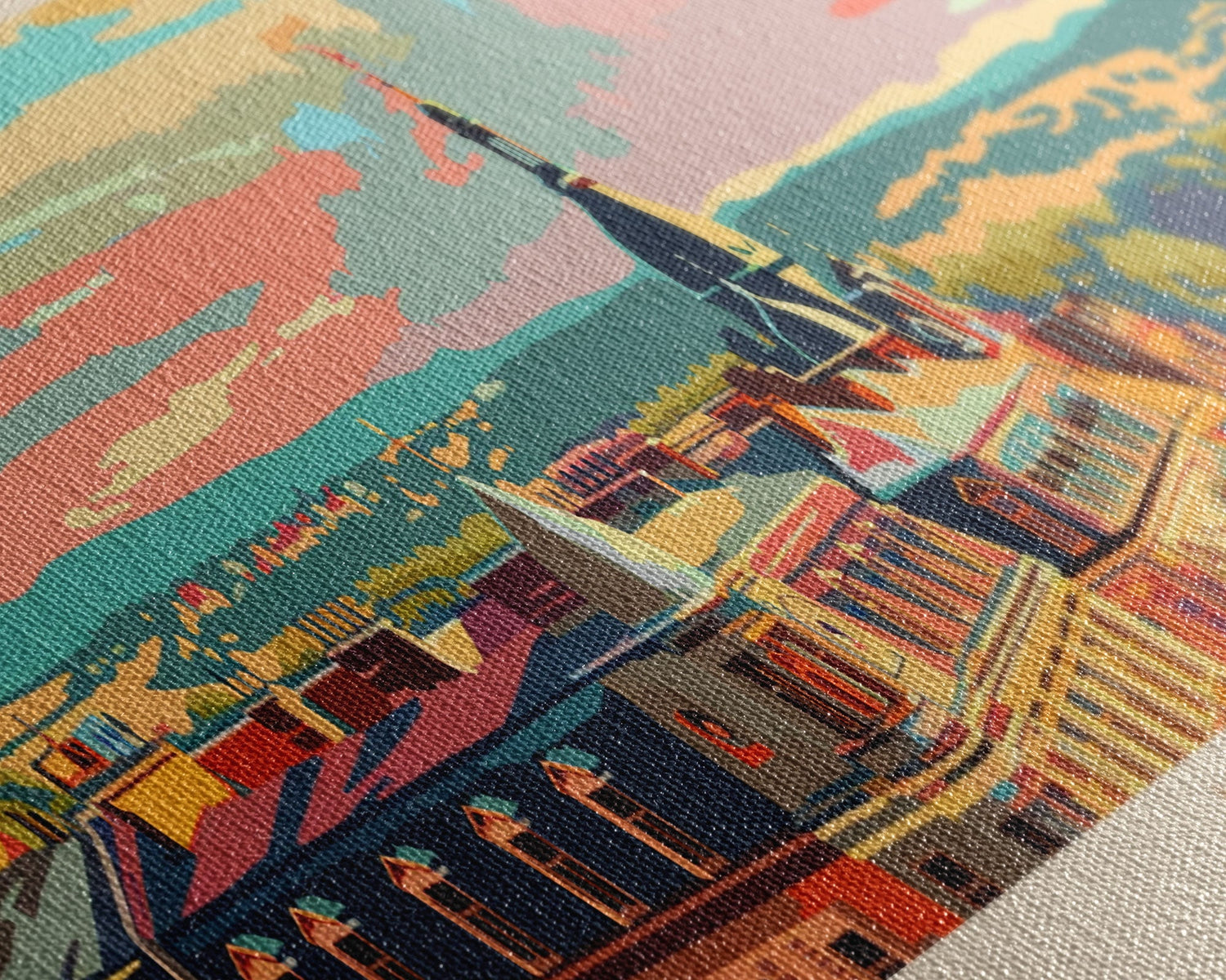 Most of our canvases are made in the USA, with the exception of canvases ordered with the light oak unstained frames, and any large canvases (24x48, 30x60, 16x48 and 20x60) ordered WITH a frame. These are temporarily made in and shipped from Europe, while we try to find a more consistent supplier in the USA.