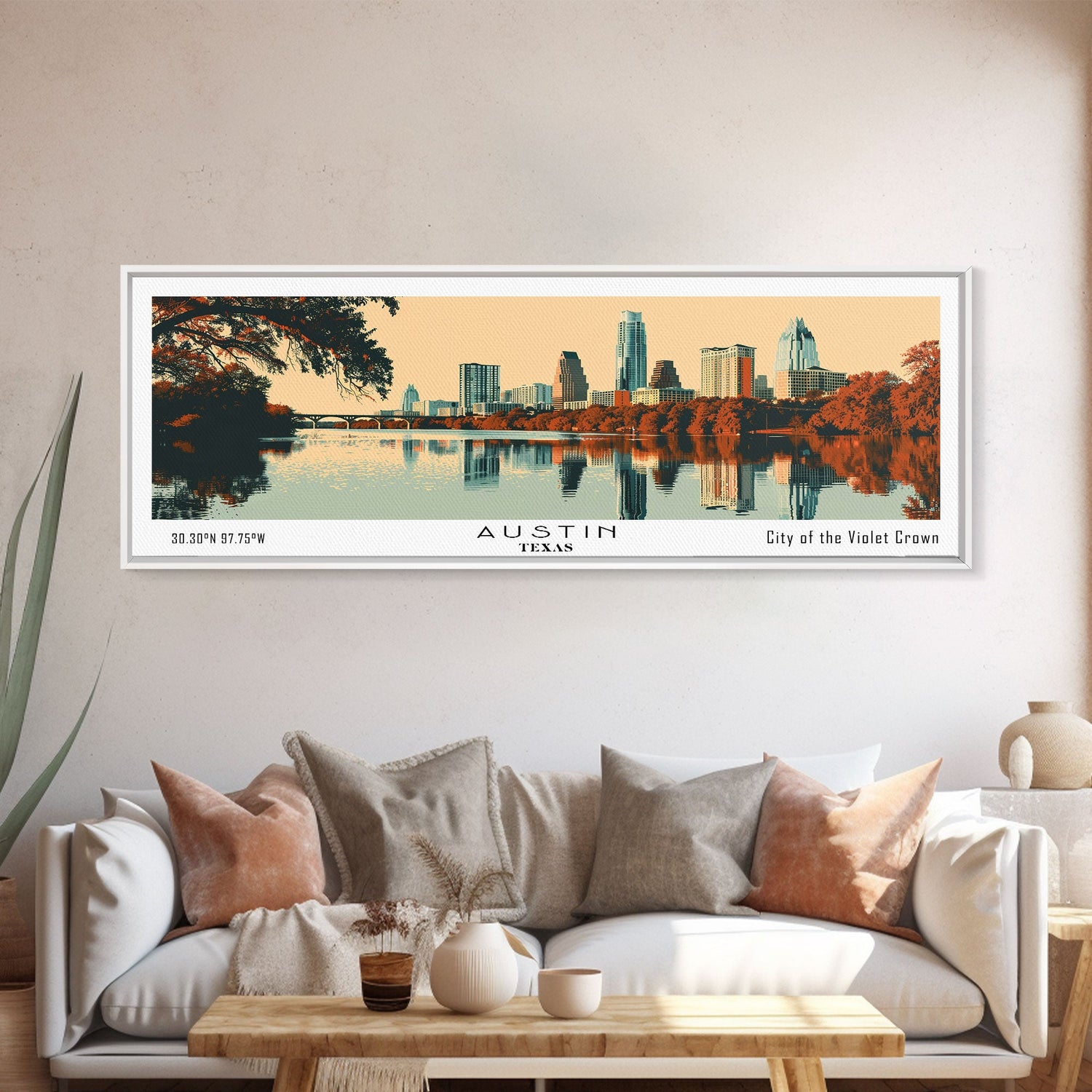 Austin Texas Panoramic Painting, Mid Century Modern Framed Canvas Print, Retro Pop Art Travel Poster, Home Decor, City Art