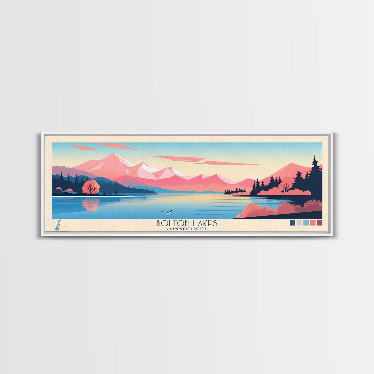 Bolton Lakes Connecticut Framed Canvas Print, Panoramic Wall Art, Midcentury Modern, Pop Art, Travel Poster, Scenic Living Room Art, Lake House Decor