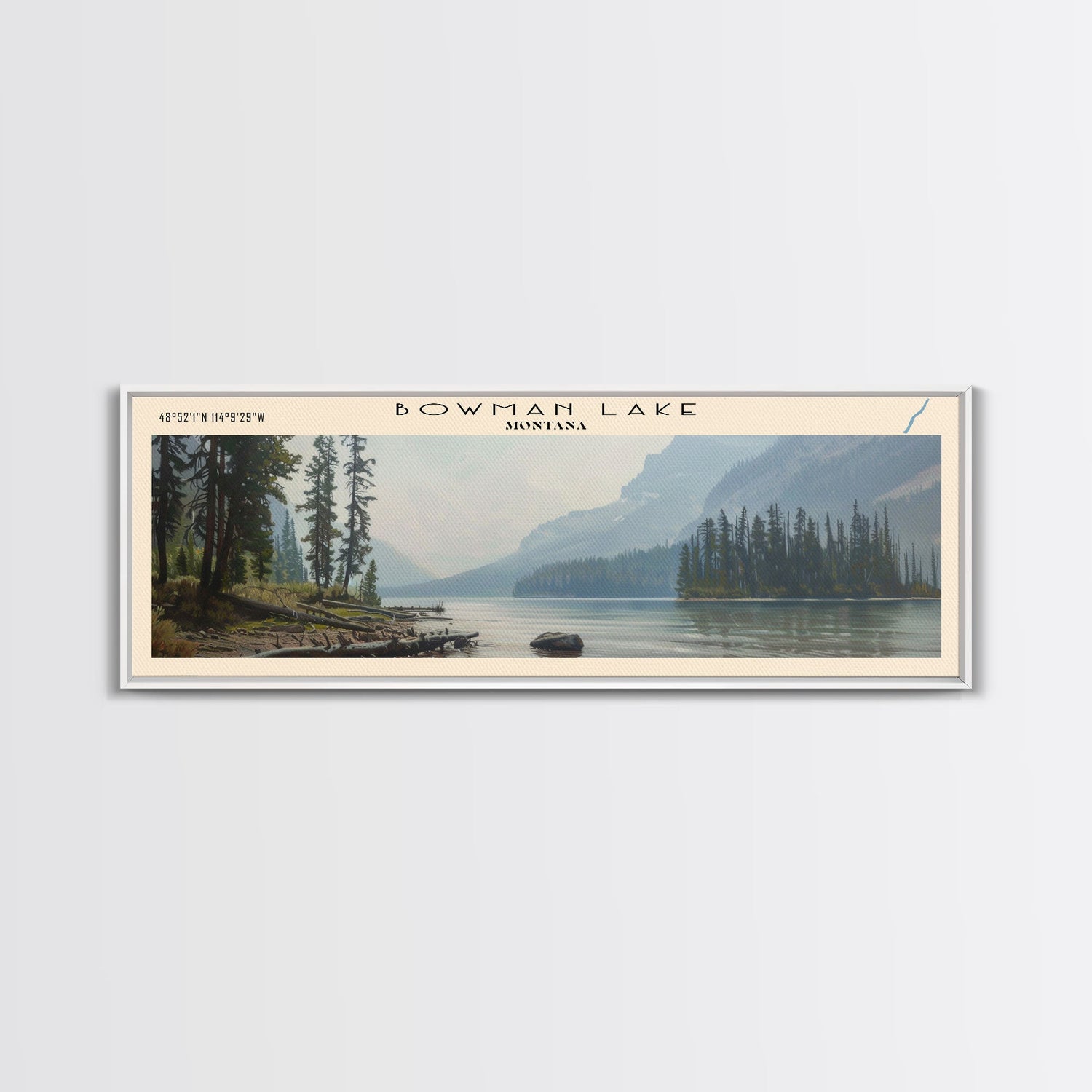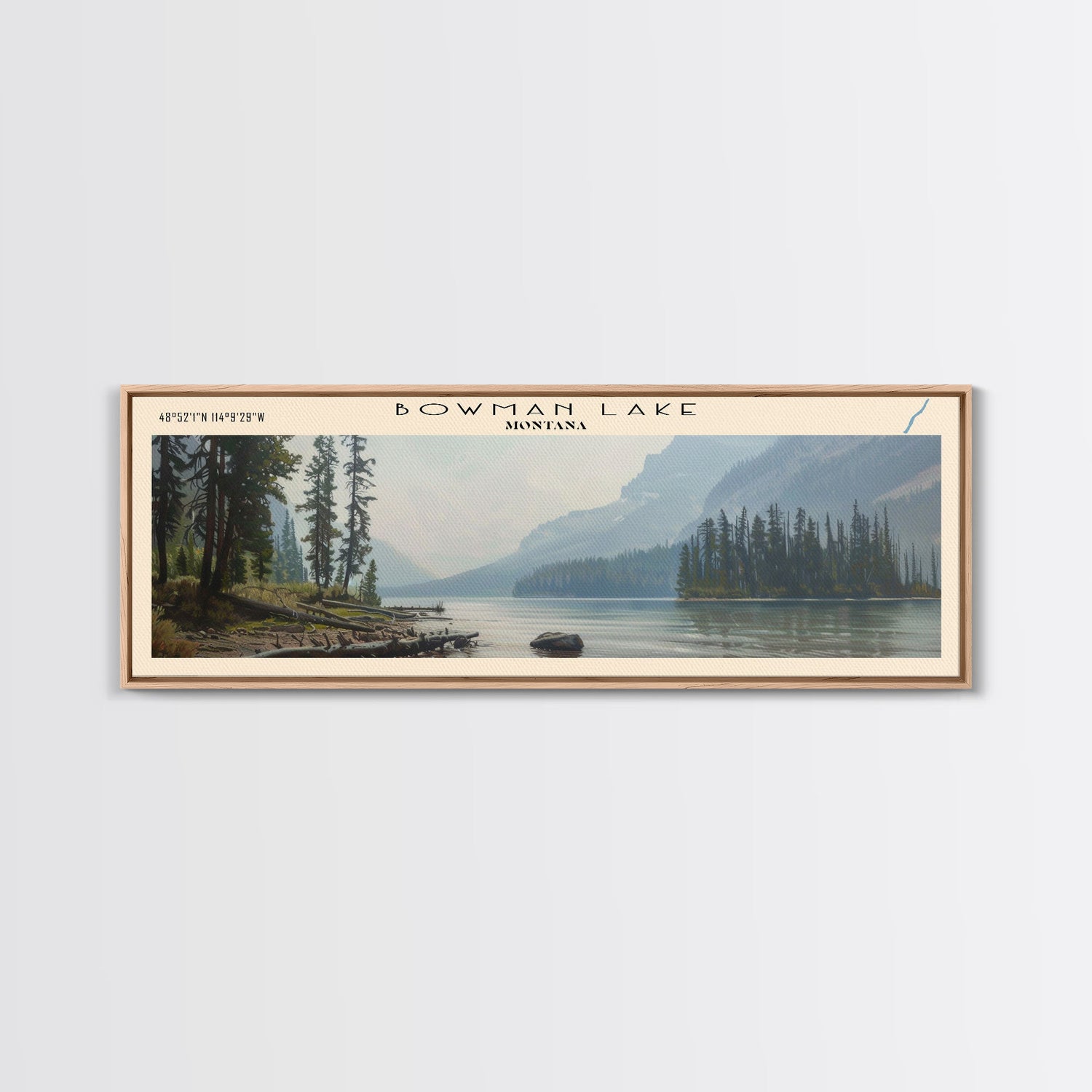 Bowman Lake Montana Framed Canvas Print, Panoramic Lake House Decor, Wall Art, Travel Poster, Rustic Lake Painting, Nature Art