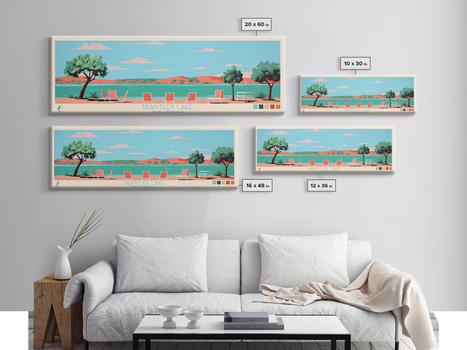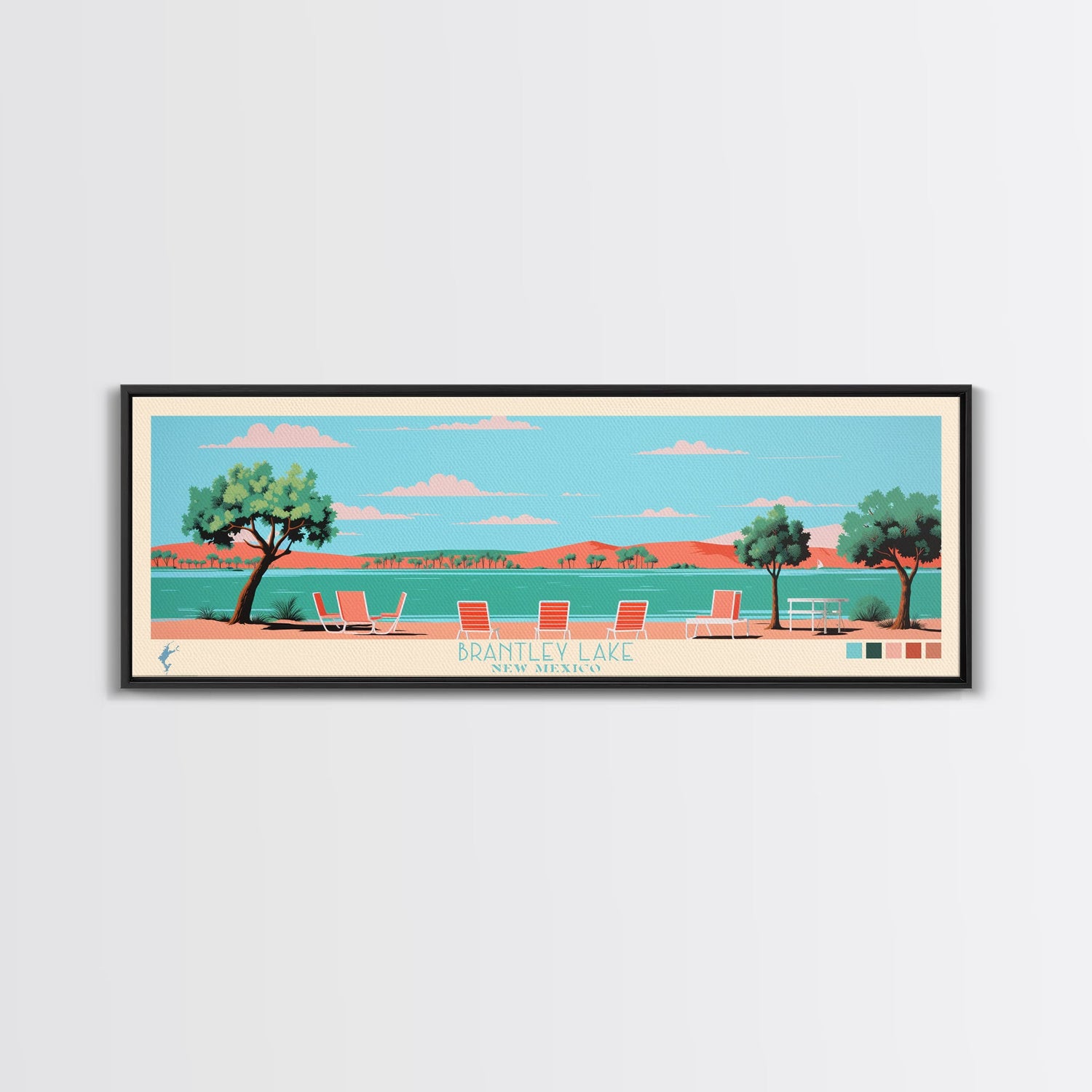 Brantley Lake New Mexico Framed Canvas Print, Midcentury Modern Panoramic Wall Art, Living Room Decor, Pop Art, Travel Poster Art, Scenic Nature Painting