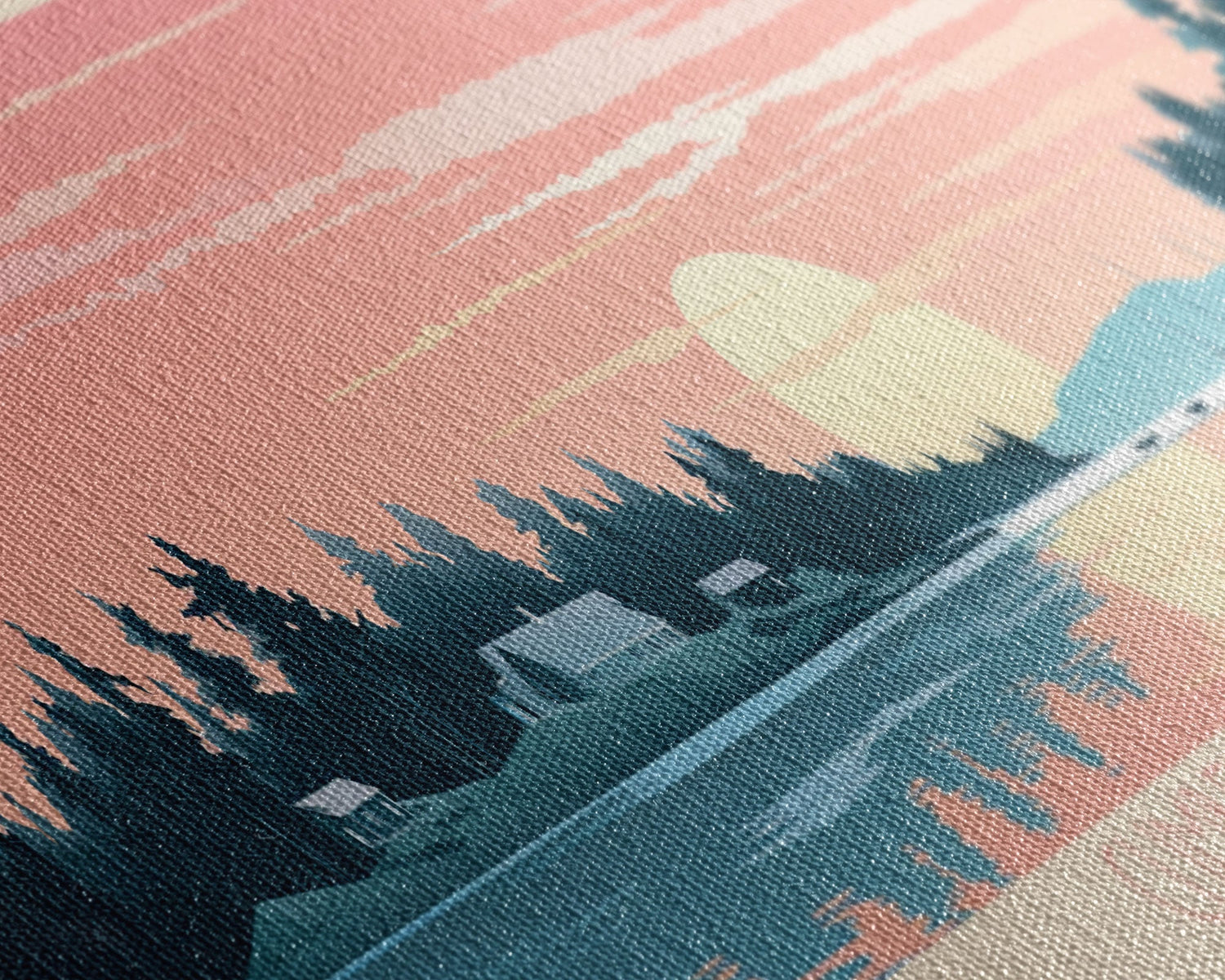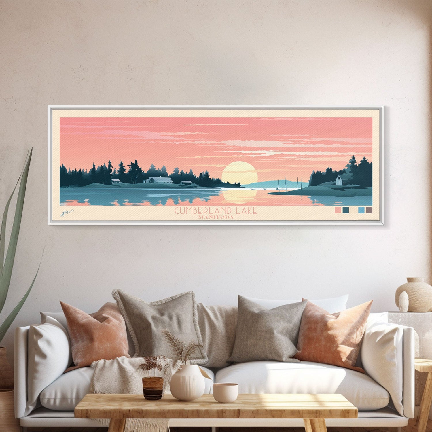 Cumberland Lake Manitoba Framed Canvas Print, Midcentury Modern Panoramic Wall Art, Living Room Decor, Pop Art, Travel Poster Art, Scenic Nature Painting