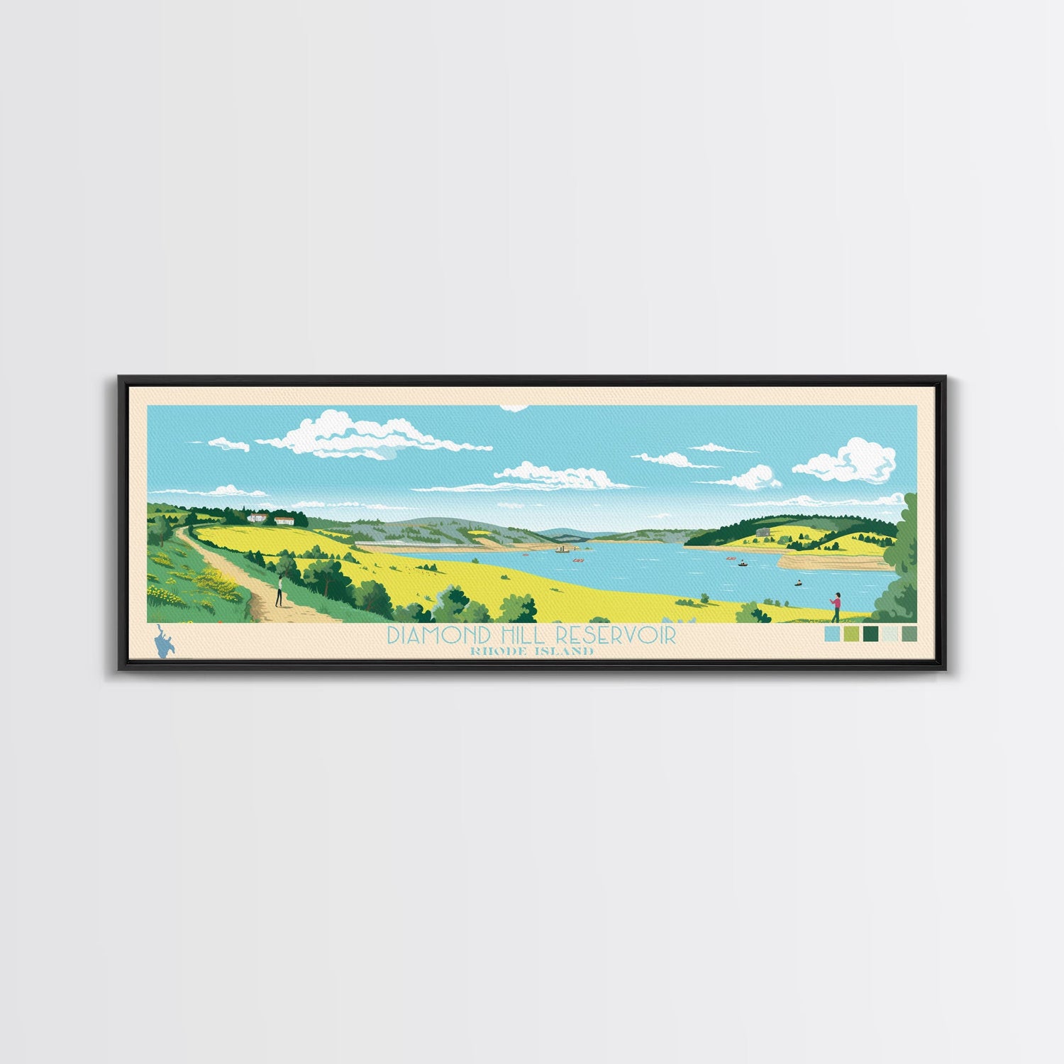 Diamond Hill Reservoir Rhode Island Framed Canvas Print, Midcentury Modern Panoramic Wall Art, Living Room Decor, Pop Art, Travel Poster Art, Scenic Nature Painting