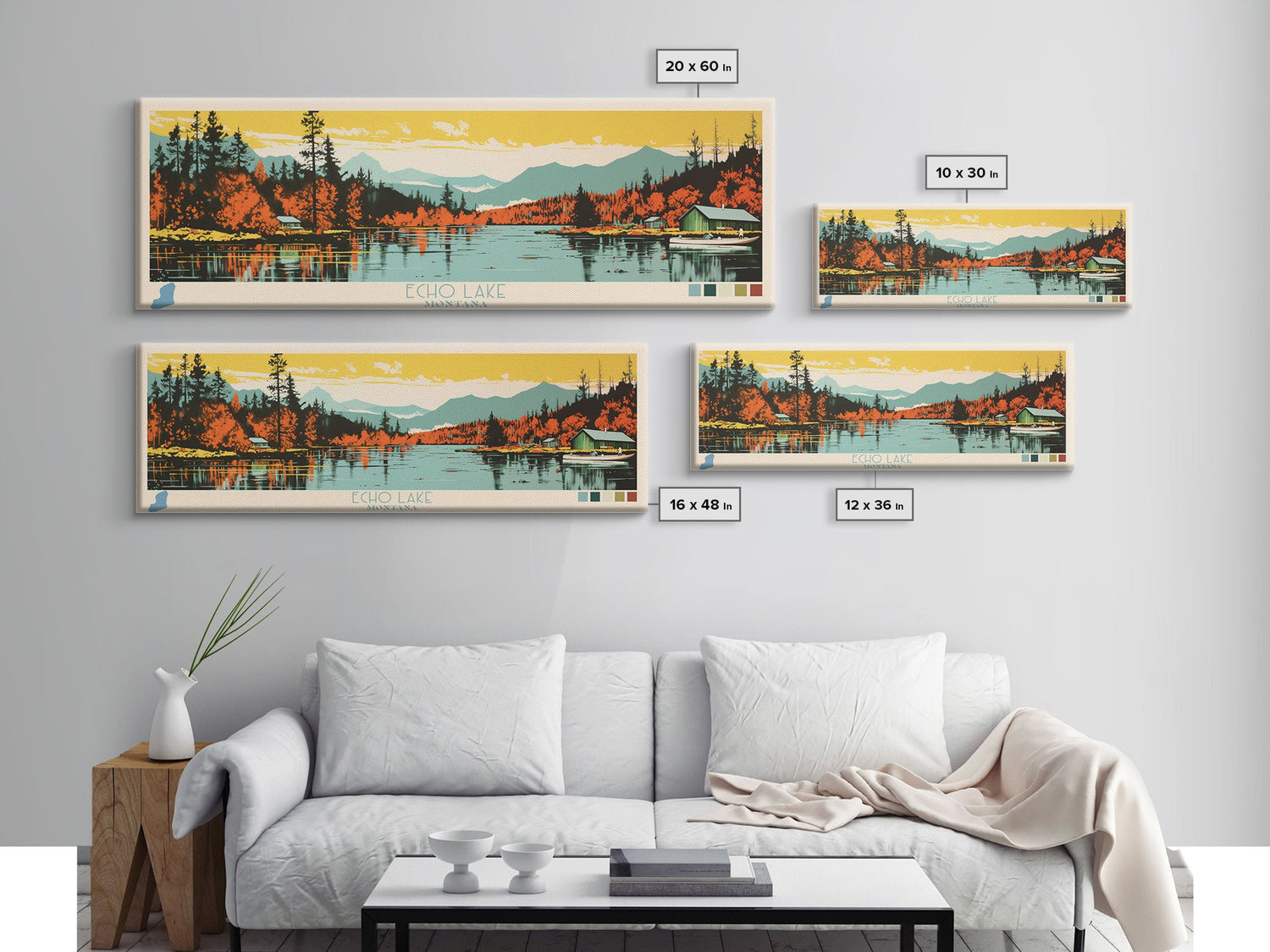 Echo Lake Montana Framed Canvas Print, Panoramic Wall Art, Midcentury Modern, Pop Art, Living Room Decor, Travel Poster, Nature Art