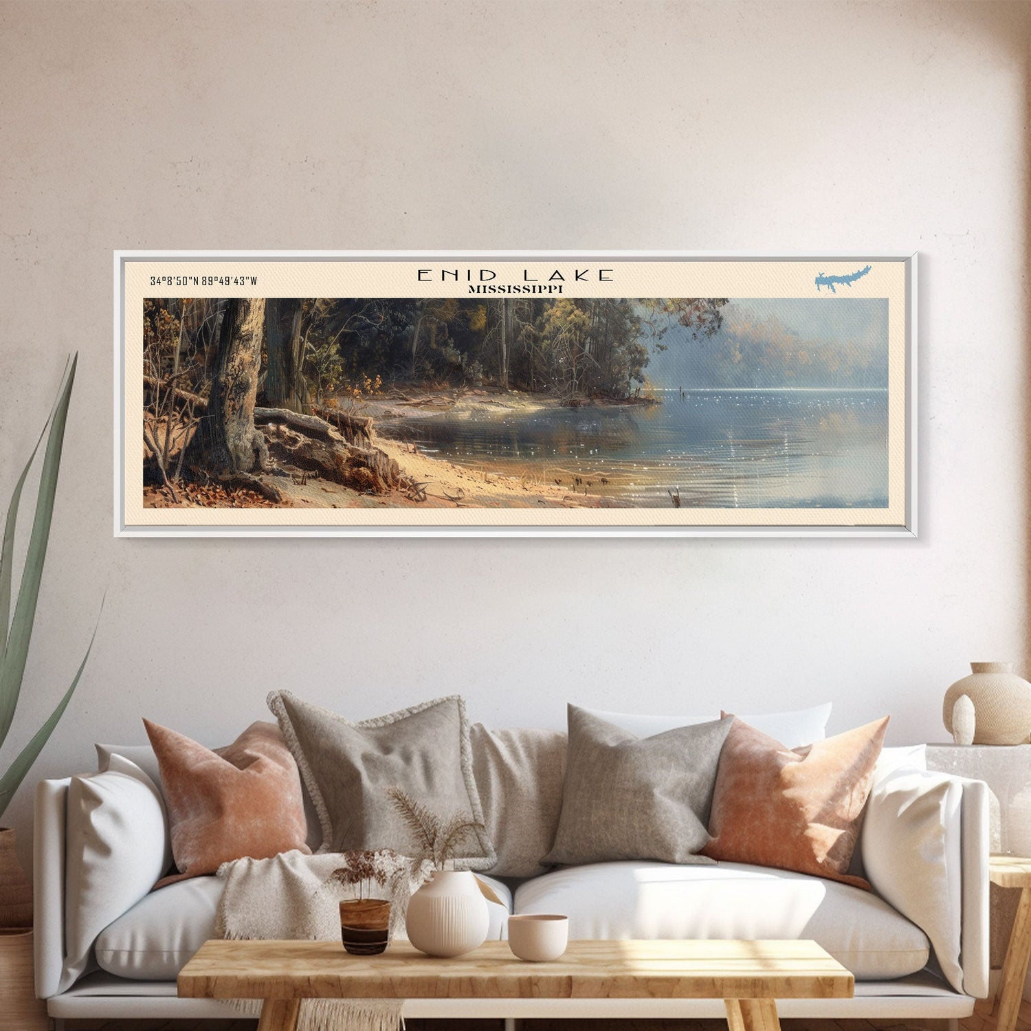 Enid Lake Mississippi Framed Canvas Print, Lake House Decor, Panoramic Wall Art, Travel Poster, Modern Lake Painting, Nature Art