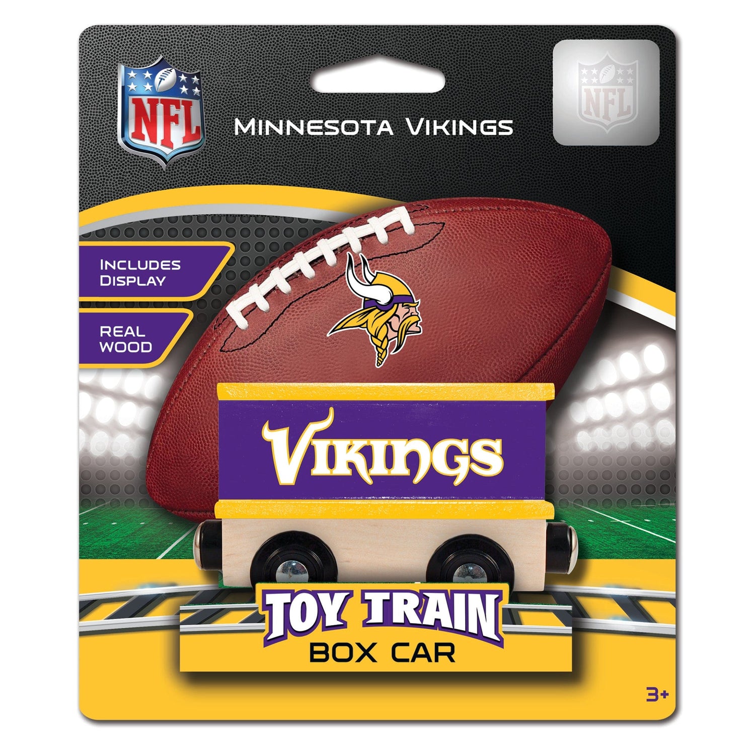 Bring home the excitement of game day with this officially licensed NFL wood train, crafted from real wood and designed for young fans ages 3 and up. Featuring a hand-painted box car in team colors with the Minnesota Vikings logo, this collectible is perfect for anyone searching for Minnesota Vikings gifts, memorabilia, or decor for a child’s room. The train car is compatible with most 1-inch wooden train tracks, making it a great addition to any toddler train set. Secure magnets on each end allow easy connection to other train cars, encouraging imaginative play and fine motor skills. Sized at 6.5 x 5.5 x 2 inches, it’s portable and easy for little hands to handle. Whether you’re shopping for Minnesota Vikings baby clothes, toddler Vikings apparel, or youth merchandise, this unique train car is a standout choice for fans and collectors alike. It’s a thoughtful gift for birthdays, holidays, or as a special surprise for any young Minnesota Vikings supporter, and it pairs perfectly with other NFL Vikings merchandise or Minnesota Vikings ornaments for a complete fan experience. No batteries required, just hours of creative play for your little one.