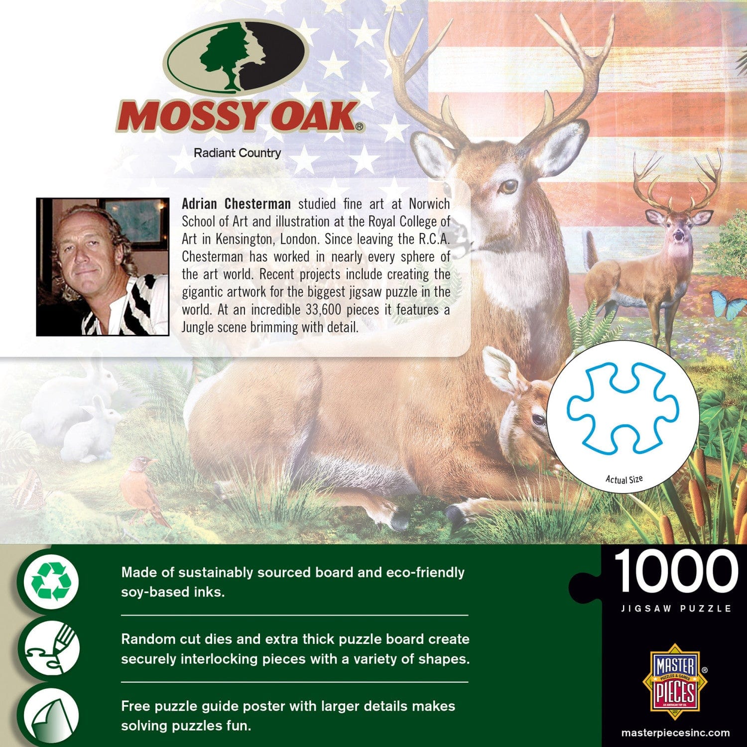 The MasterPieces Mossy Oak - Radiant County 1000 Piece Jigsaw Puzzle is designed for children and adults ages 14 and up. This puzzle features a stunning image of a Family of Deer under the American flag, perfectly blending nature and patriotism. With its 19.25" x 26.75" dimensions and 1000 pieces, it offers an exciting challenge for puzzle enthusiasts. Additionally, you can feel good about your purchase as the puzzle's chipboard is crafted from 100% recycled material, making it an environmentally friendly choice.