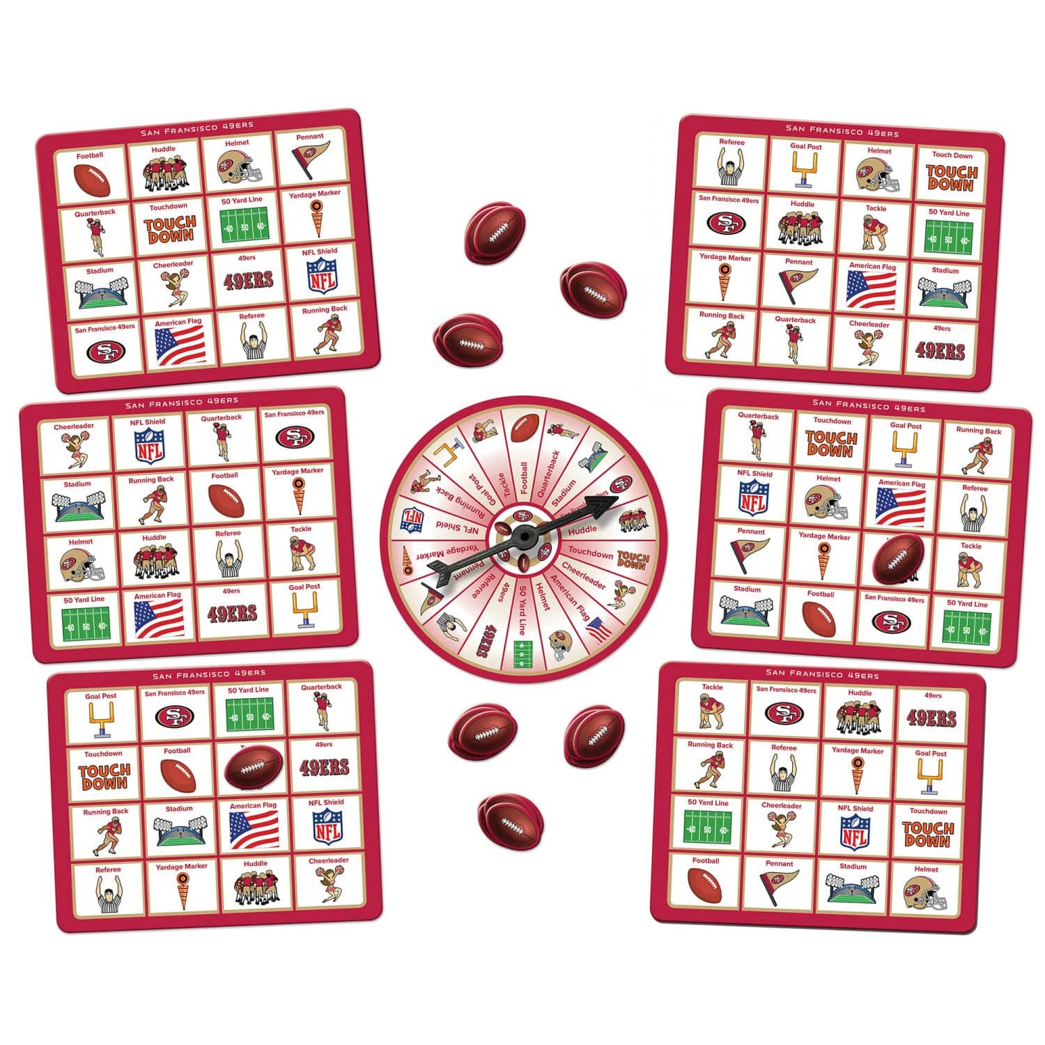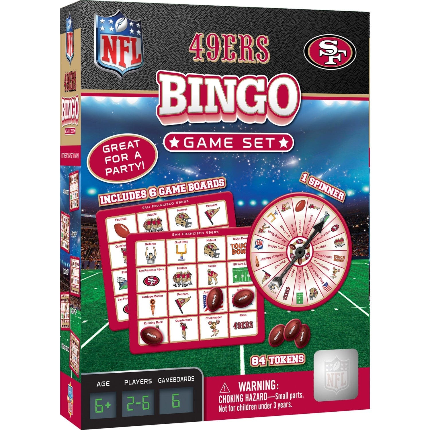 Play bingo with your favorite NFL Team!  This San Francisco 49ers Bingo Game puts a football spin on the family favorite.  Many of the symbols represent your favorite NFL Team and other football memorabilia.  Make all 9 matches and be the first to shout BINGO!  This MasterPieces Bingo Game includes 1 spinner, 6 gameboards, and 84 custom tokens.  Perfect for ages 3 and up.